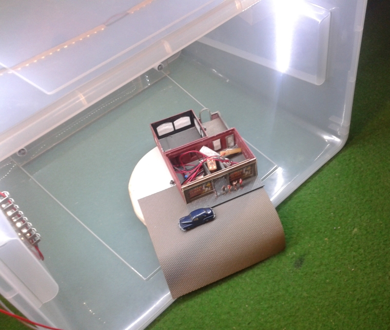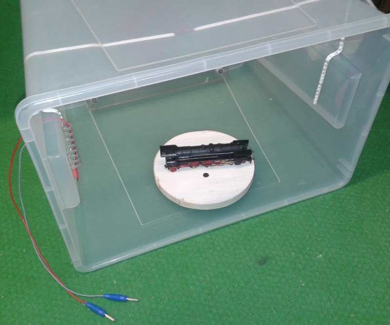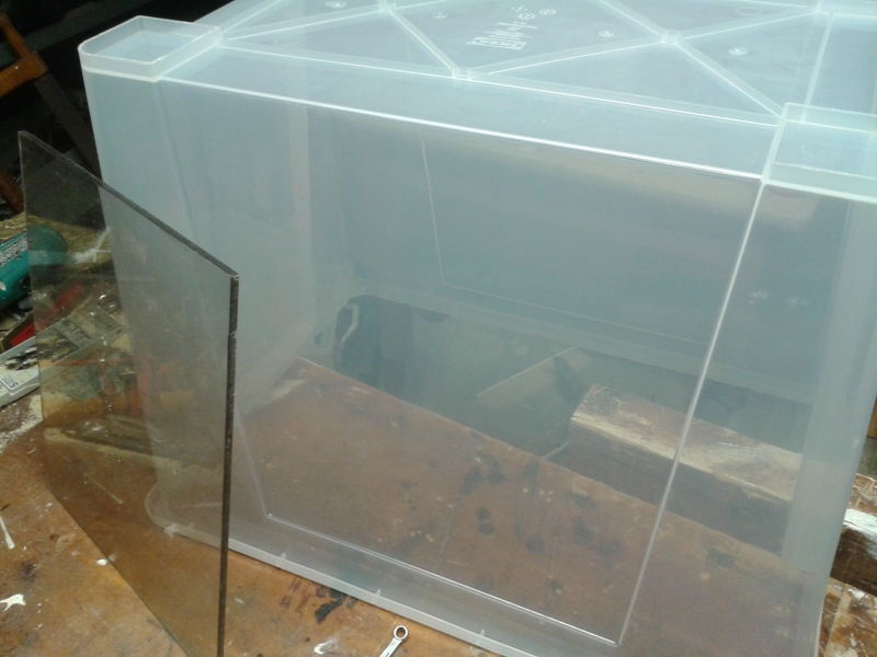 Mir fiel eine Aufbewahrbox aus halbwegs klarem Kunststoff in die Hände. Die Absaugung sollte indirekt sein, also baute ich einen doppelten Boden ein, der ringsum einen Spalt freilässt. In der Mitte des (ehemaligen) Box-Bodens kommt ein Loch, das passend zum Staubsaugerschlauch sein soll.