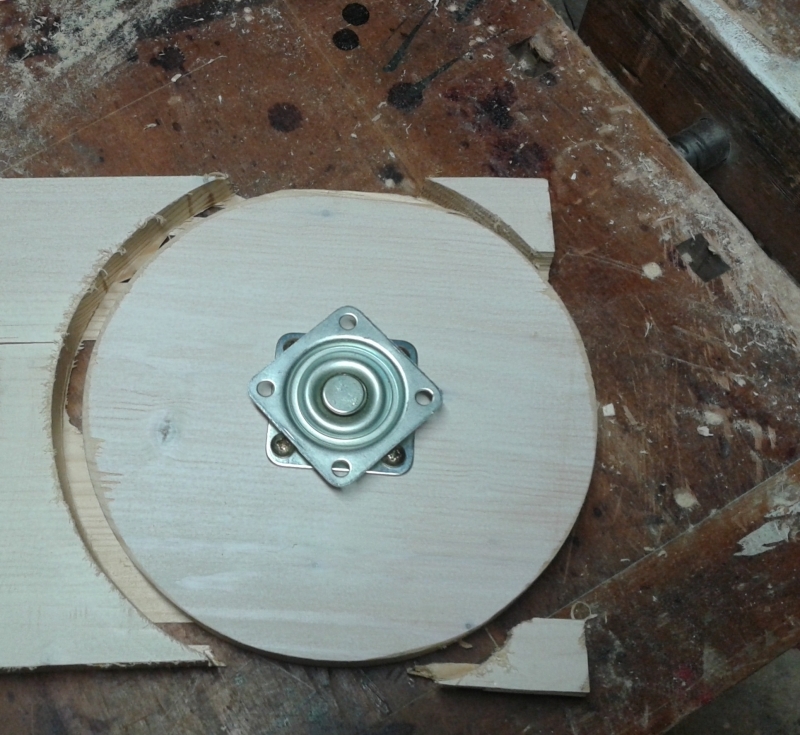 Die Objekte der Lackierung sollten auf einem Drehteller Platz finden. In der Wühlkiste fand ich einen „Drehschemel“, keine Ahnung von was der war, vermutlich von einem ausrangierten Fernseh-Möbel. Perfekt für den Zweck. Ein Stück Leimholz wird auf den Durchmesser von etwa 20 cm gebracht.