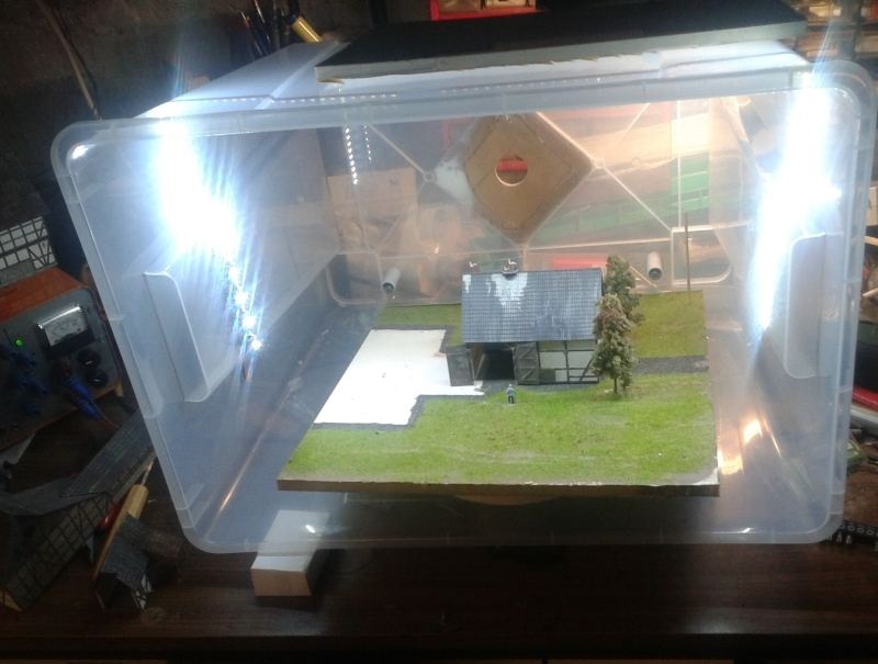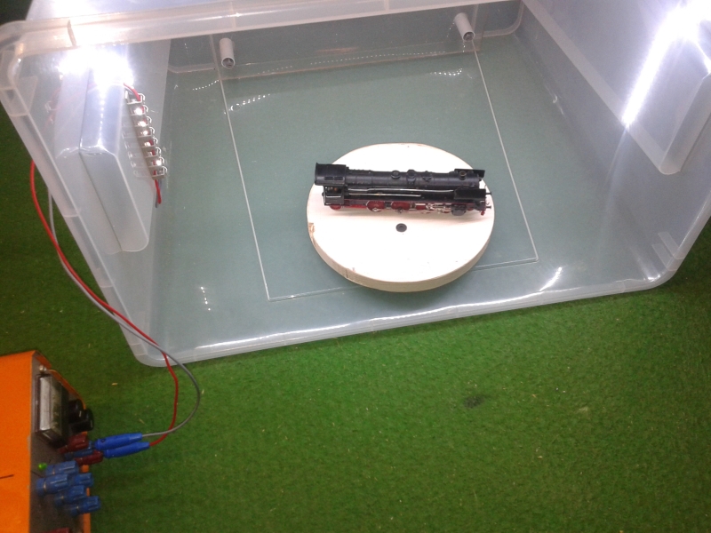 An ein Ende noch zwei Litzen für die Stromversorgung. In eine der Seitenwände wird ein Loch für die Kabel gebohrt (Vorsicht…!), dann werden die Strips (selbstklebend!) rechts, oben und links an die Wände der Box geklebt. Noch zwei Büschelstecker (Laborstecker) an die Kabel, so dass die Beleuchtung von einem regelbaren Netzgerät gespeist werden kann. Hallo, ist das hell. ***Fortsetzung folgt***