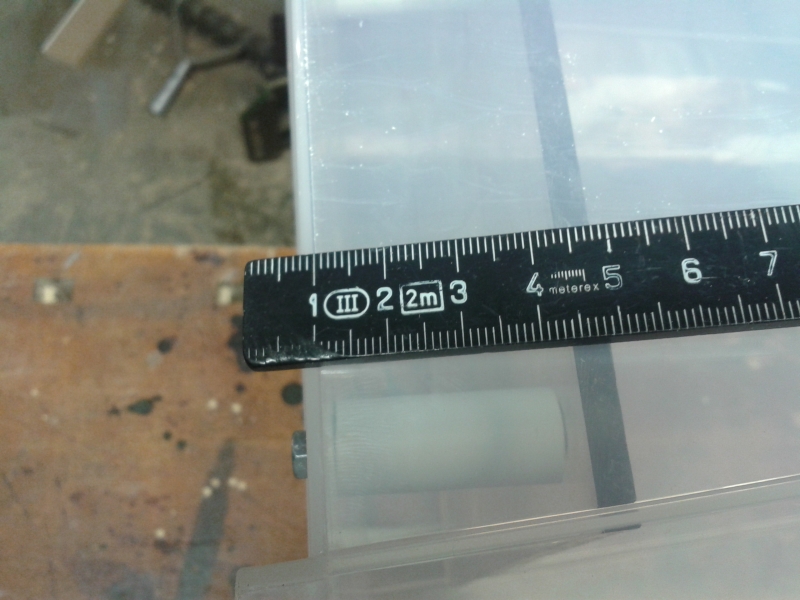 Dabei fand ich, dass das Material eher spröde ist und bei etwas zu viel Druck mit der Bohrmaschine zum Platzen neigt. Kurzerhand wurde das Loch am Boden erweitert, ein Sperrholzrest mit passender Bohrung und reichlich elastischem Kleber eingepasst.