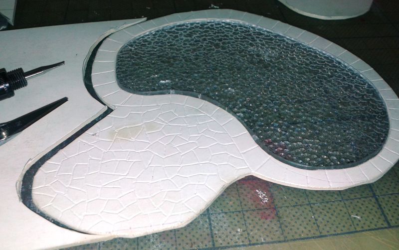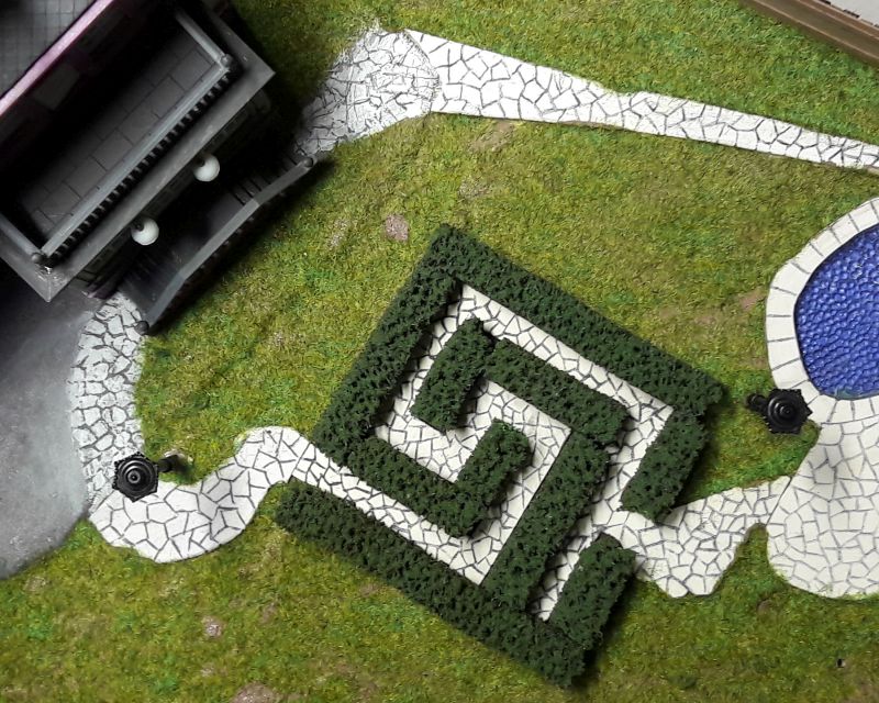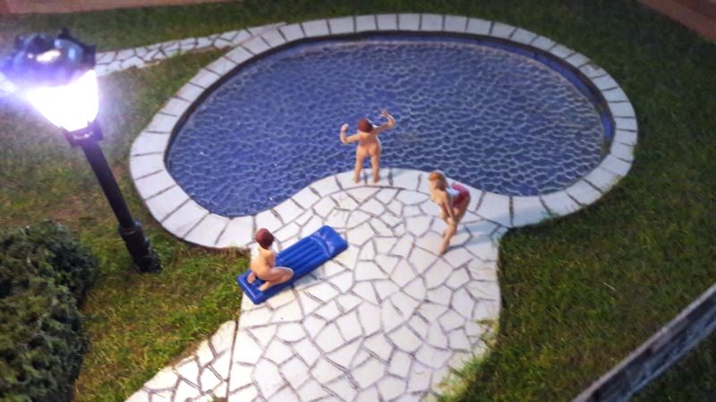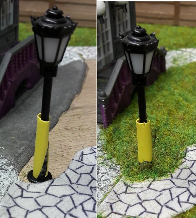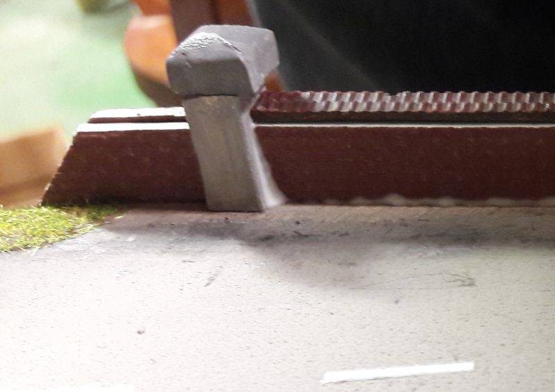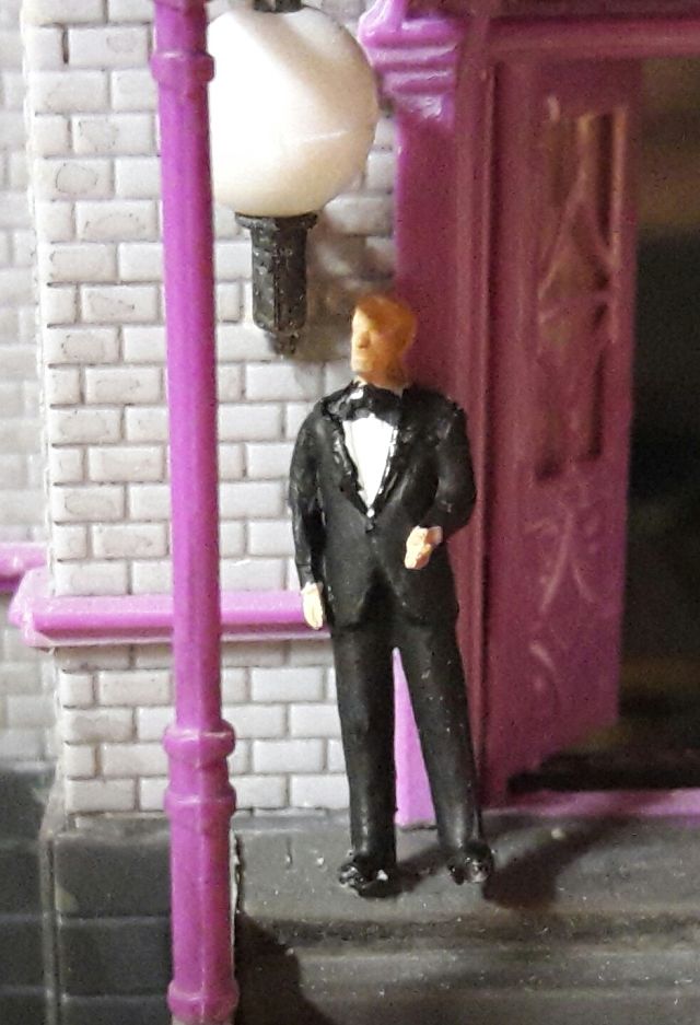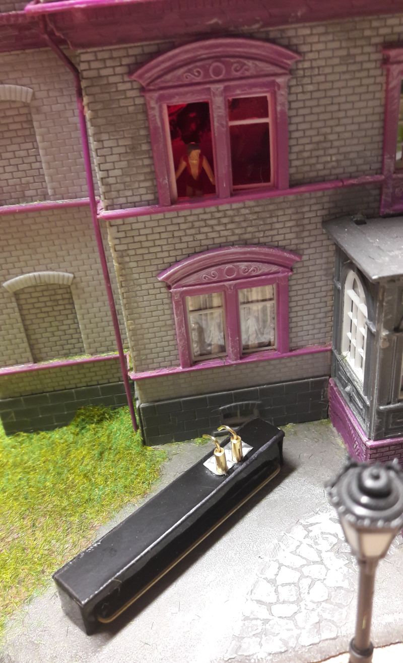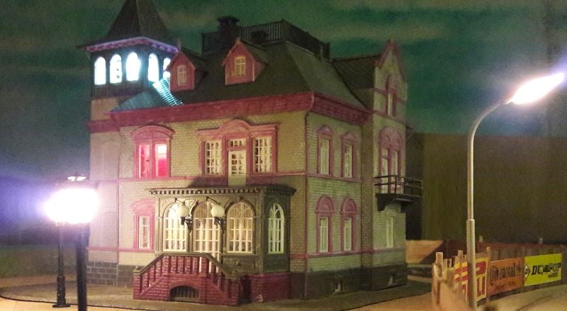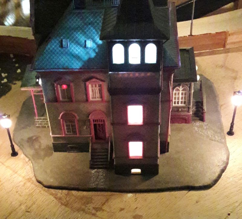 Das funktioniert! Die Farbe ist zwar nicht besonders griff-fest, aber bis zum einmaligen Einbau reicht es schon. Eine weitere 16V-Lampe wird in den unteren Teil des Turmanbaus gesetzt, mittels eines Drahtes auf etwa halbe Höhe, um gleichmäßige Ausleuchtung zu erreichen. Denn der Turm und das Rote Zimmer sind die einzigen Abteile im Haus, die wirklich lichtdicht sind.