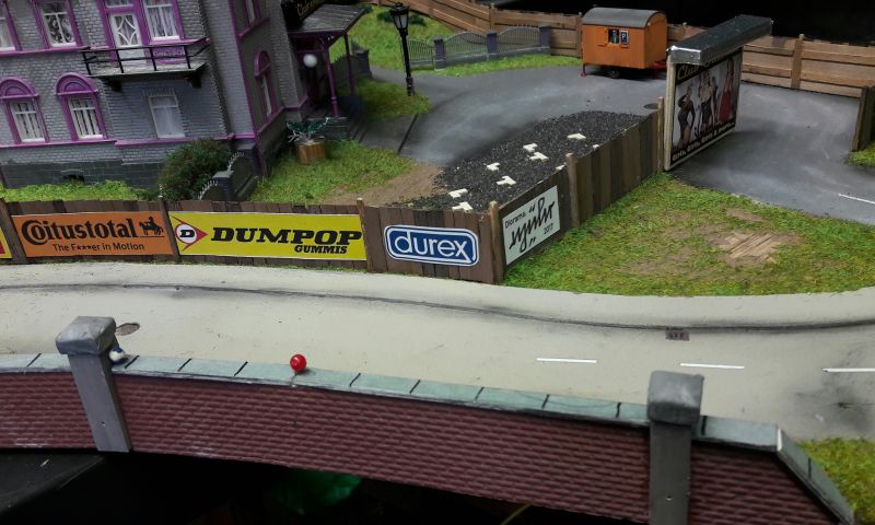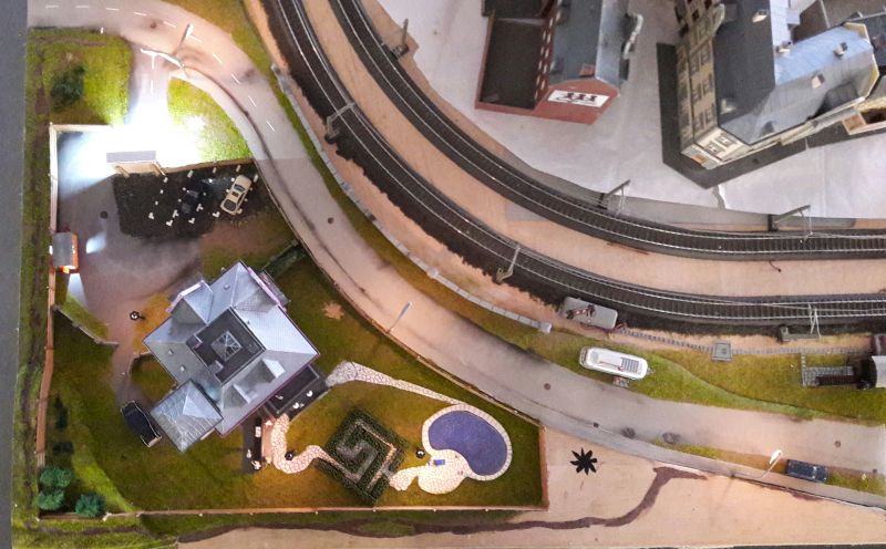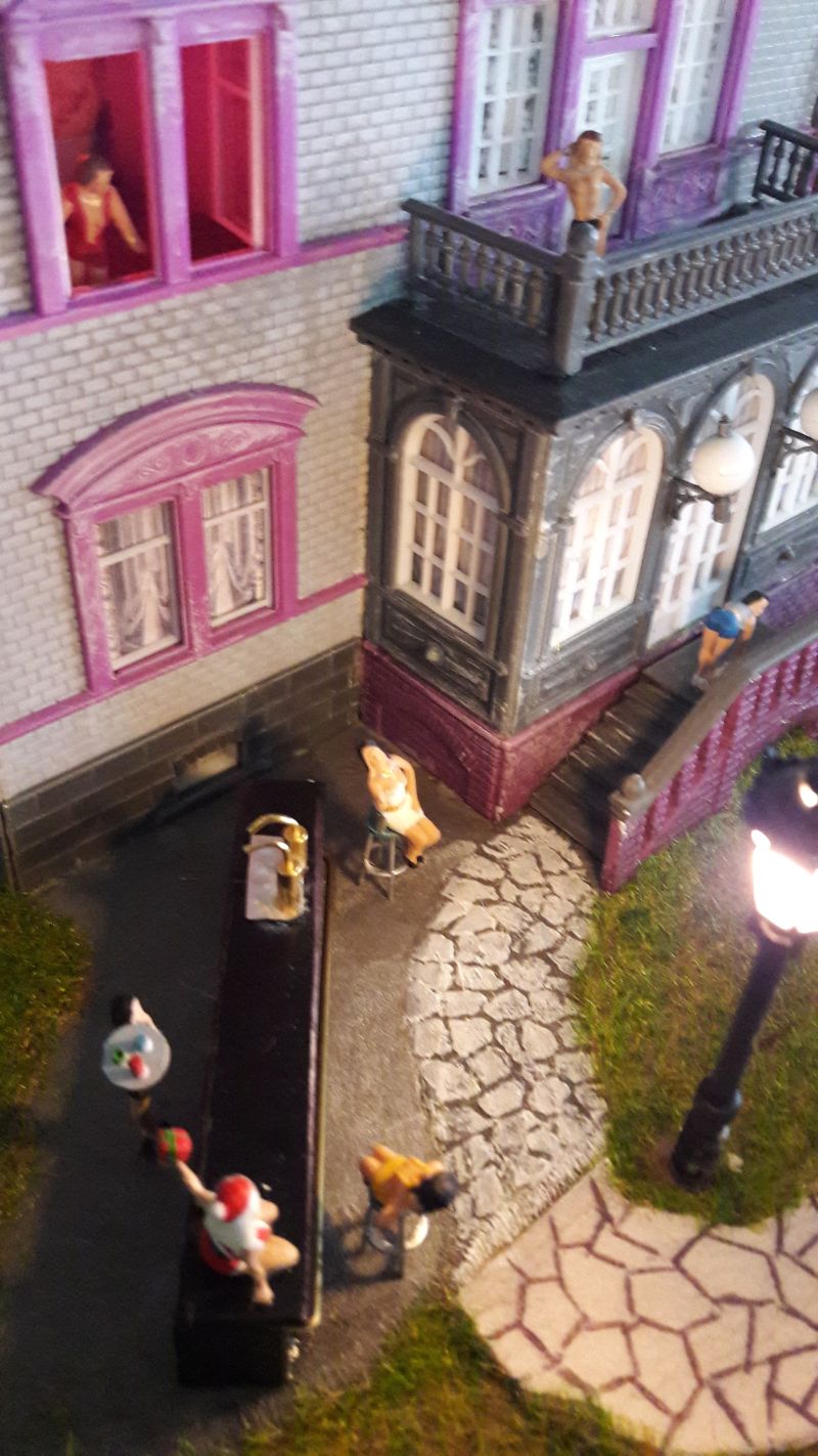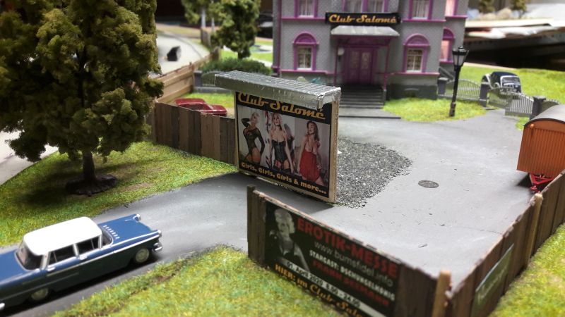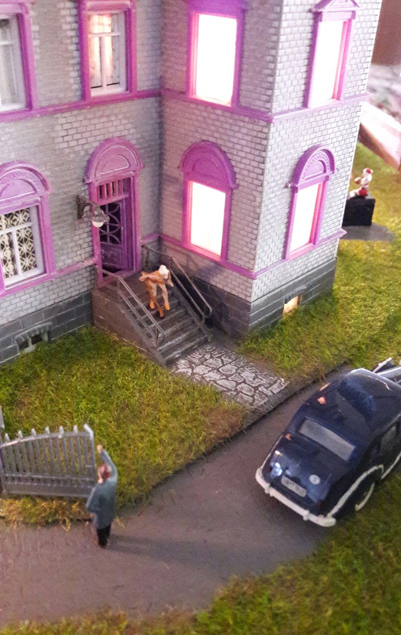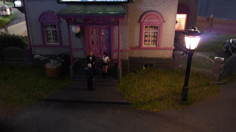 Der Kabelbaum (Herzchen, Rotes Zimmer, Turm unten, Turm oben und Leuchtreklame) wird durch das reichlich bemessene Bohrloch in den Untergrund geschoben, das Gebäude aufgestellt, immer noch ohne Dach, und mit dem Untergrund - verschraubt. (Eine Maßgabe war, auf möglichst weitgehende Wiederverwendbarkeit aller Bauteile zu achten.) Ein Stückchen Tischlerplatte wird für das Fundament so zurecht gesägt, dass es innen auf den Rändern der Grundplatte des Hauses aufliegt. Dann mit drei kräftigen, kurzen Schrauben festsetzen. Das hält sofort und ist in gewissen Grenzen korrigierbar. Jetzt erst wird das Dach aufgelegt, aber für eventuelle Reparaturen ungeklebt gelassen.