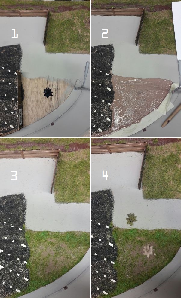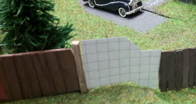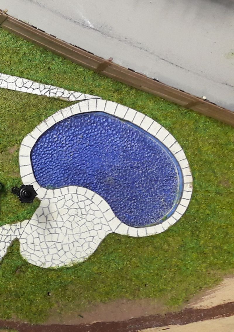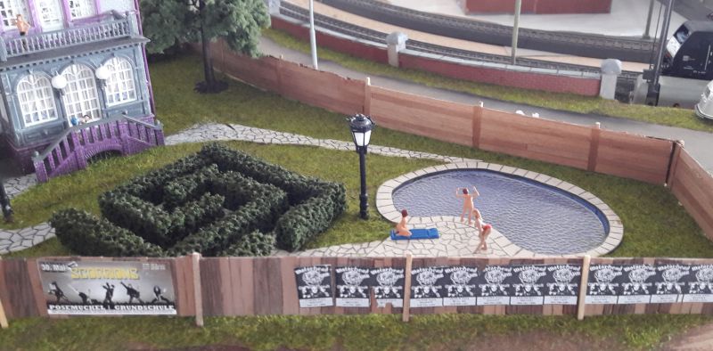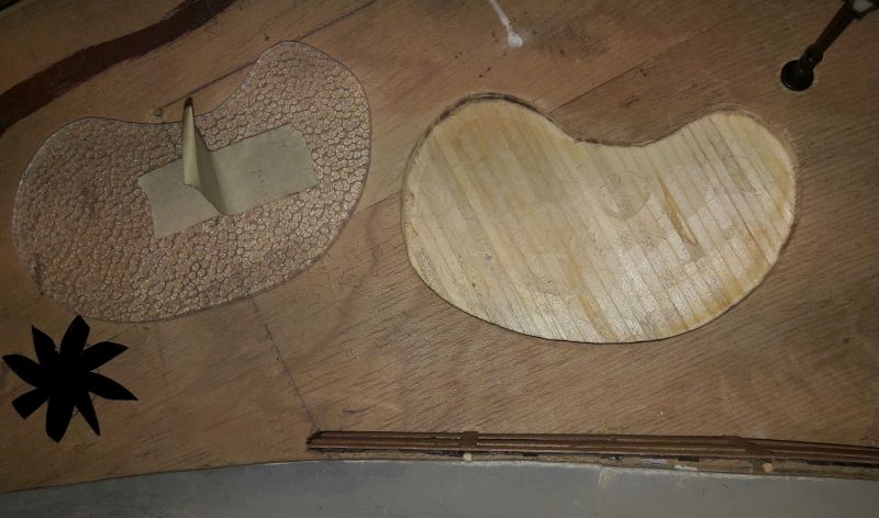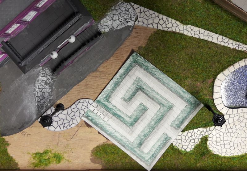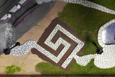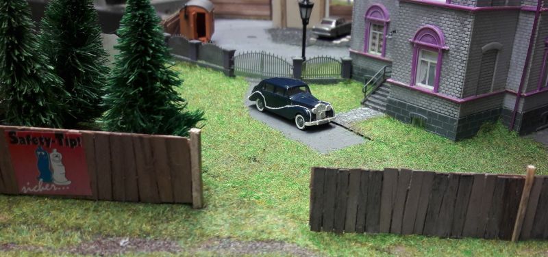 Der Kabelbaum (Herzchen, Rotes Zimmer, Turm unten, Turm oben und Leuchtreklame) wird durch das reichlich bemessene Bohrloch in den Untergrund geschoben, das Gebäude aufgestellt, immer noch ohne Dach, und mit dem Untergrund - verschraubt. (Eine Maßgabe war, auf möglichst weitgehende Wiederverwendbarkeit aller Bauteile zu achten.) Ein Stückchen Tischlerplatte wird für das Fundament so zurecht gesägt, dass es innen auf den Rändern der Grundplatte des Hauses aufliegt. Dann mit drei kräftigen, kurzen Schrauben festsetzen. Das hält sofort und ist in gewissen Grenzen korrigierbar. Jetzt erst wird das Dach aufgelegt, aber für eventuelle Reparaturen ungeklebt gelassen.