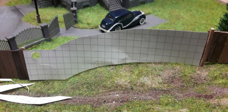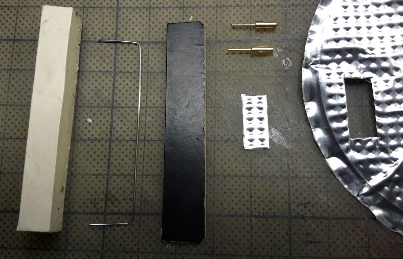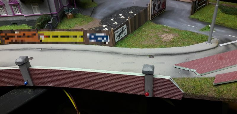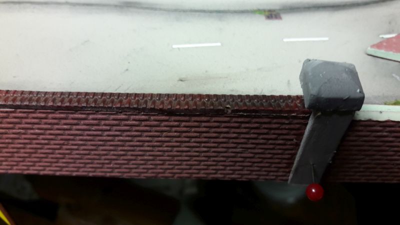 Kein Hexenwerk. Ein Sperrholzbrettchen bildet die Wand, ein kleineres eine Art Dach oben, nach vorne, unter das wir wieder einen unserer 6er-LED-Strips kleben. Als Blendschutz davor, also gegen den Betrachter noch ein kleiners Brettchen. Das Kabel durch eine Bohrung nach hinten, auf der Rückseite verkleben und am Austellort eine entsprechende Bohrung in den Untergrund vorsehen. Der Kasten mit den LEDs wird dann noch mit Alufolie umkleidet, um einen blechernen Eindruck zu machen.