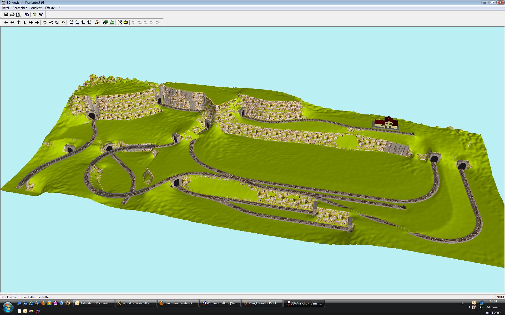 -auf ebener Fläche eine Doppel-Parade-Strecke die vorne herläuft, mit Bahnhof im Vordergrund, und dann hinten rechts im Berg verschwindet, und ganz links wieder hinaus kommt,