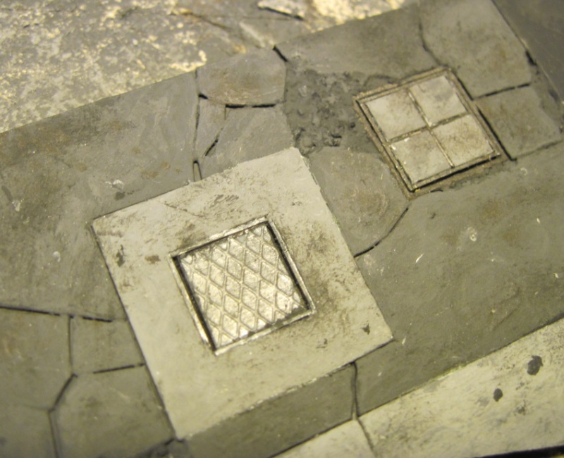 Das endgültige Ergebnis: Die Metallfassungen sind im metallischen Look angestrichen worden, und jeweils 4 kleine (bemalte) Polystyrol Quadrate finden innerhalb des Metallgeflechts ihren Platz! Die Alterung betont noch einmal den Gesamteffekt. Fertig sind zwei Strassendeckel im Massstab 1:87!