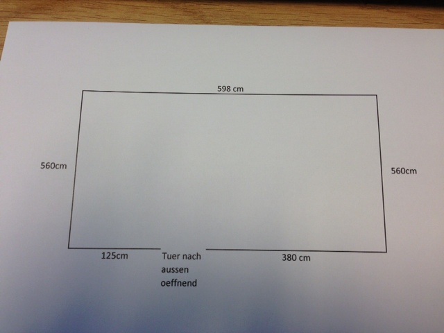 Abmessungen sind: 598 cm*560cm, Hoehe 2,00 m , Tuer geht nach aussen auf und hat vom linken Rand einen Abstand von 125cm und von rechts von 380cm.