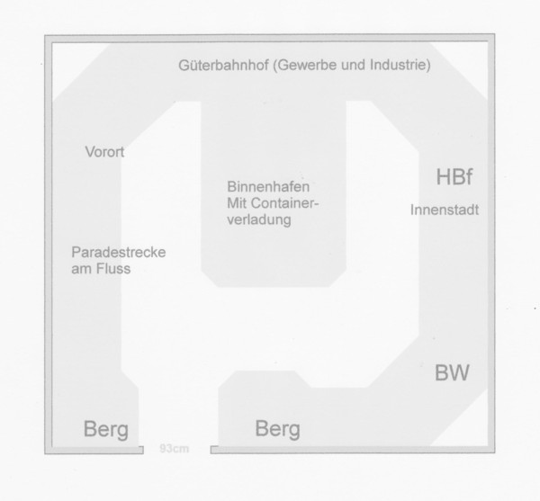 Ich dachte als Basis an eine umlaufende 2 gleisige Paradestrecke, mit kleinen Ueberraschungen in der Gleisfuehrung ( durch Tunnel, Abzweigungen zum Schattenbahnhof oder anderen Ebenen ).