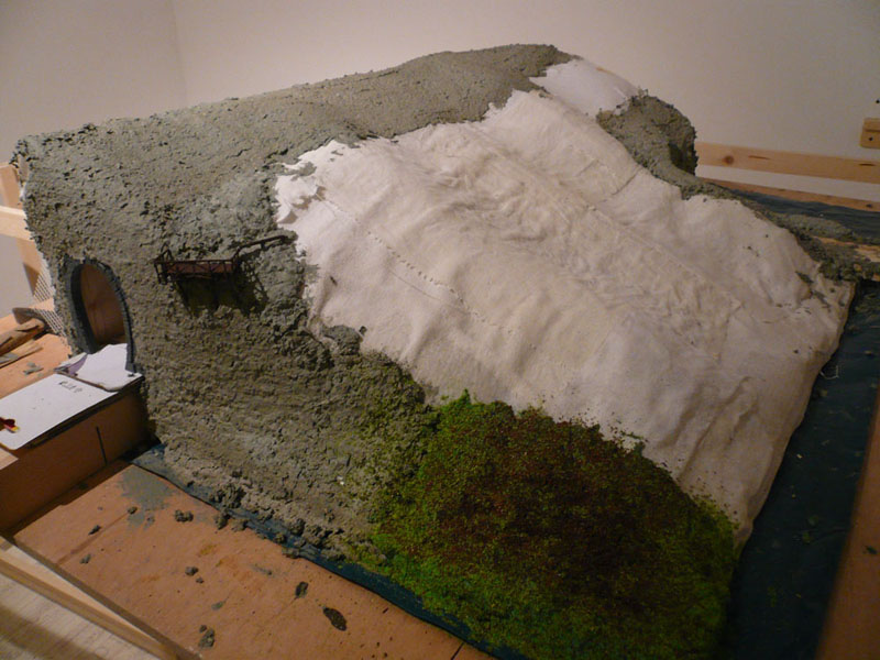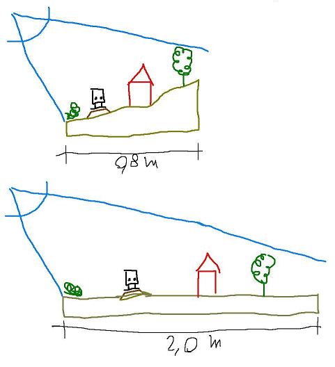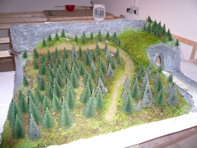 Die an der Wand entlang geführte Anlage braucht nicht sehr tief zu sein, 60 bis 80 cm reichen völlig. Um die illusorische Wirkung eines so schmalen Landschaftsstreifens zu verbessern, lässt man idealerweise das Gelände vom Betrachter weg nach hinten ansteigen, und endet an der hinteren Kante noch mit einem bewaldeten Hügel, dann wird neben dem großen horizontalen auch ein ziemlich großer vertikaler Blickwinkel abgedeckt. Willst du flaches Land ohne Bäume darstellen, geht das natürlich schlechter, dann verwendet man statt dessen eine ca. 30 - 60 cm hohe Hintergrundkulisse, die den weiteren Landschaftsverlauf und den Himmel darstellt.