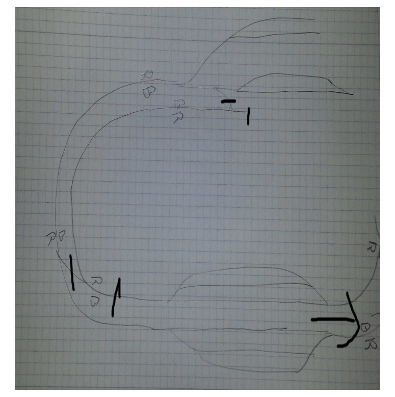 Beim Außengleis ist R außen und B innen, beim Innengleis ist R innen und B außen - und am Übergang treffen R und B aufeinander und umgekehrt.