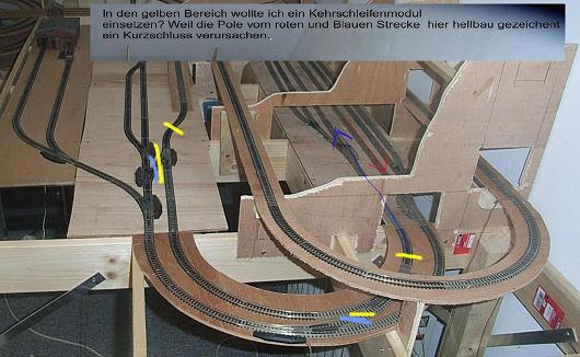 ich kann hier keine Kehrschleife erkennen. Also wird Dir eine Kehrschleifensteuerung nicht viel weiter helfen. Um wirklich helfen zu können, teile uns bitte die Einspeisepunkte mit und ob diese von separaten Fahrgeräten versorgt werden. Bitte zeige uns den kompletten Gleisplan. Die einzelnen Kreise müssen sorgfältig von einander getrennt sein. Ich gehe von Gleichspannung aus.