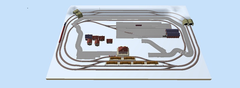 Ein Verbesserungsvorschlag zum vorliegenden Plan wäre, den Kreisverkehr noch mehr zu kaschieren, indem man die Tunnels direkt vorne rechts und links in den Kurven beginnen lässt. Außerdem ist die Straße völlig unrealistisch: quasi ein Ring ohne Verbindung zur "Welt außerhalb", zudem derart enge Kurven, dass kein LKW oder Bus durchpassen würde. Daher vielleicht etwas weniger Straße, z.B. eine einzelne von hinten nach vorne zum Bahnhof, und fertig. Das bringt mehr, als die ganze Anlage damit zu überfrachten.