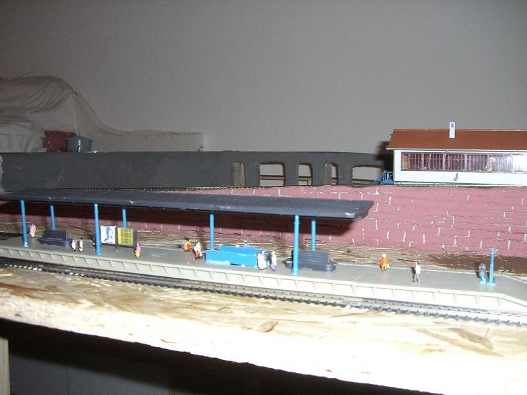 Der ansteigende Bahndamm in der Mitte ist etwas zu deutlich, will sagen, man sieht, dass er nur Selbstzweck ist. Vielleicht sollte er in den einen oder anderen Hügel übergehen, was das Ganze glaubhafter macht. Die Mauer des Dammes (hinter dem Bahnsteig) ist zu "grob" gemauert, wenn ich die Größe der Steine mit den Figuren (sind H0-Männekes, ja?) vergleiche. Vielleicht nochmal mit Gips überziehen und feiner gravieren. Und dem Viadukt im Hintergrund stünde eine Mauerverkleidung sicher auch gut zu Gesichte.