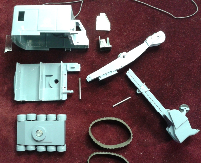 Der Baggerlöffel hat gut gepflegte Zähne. (Das ist wichtig, liebe Kinder! Gesunde Zähne sind unverzichtbar für einen gesunden Körper.) Aber hier ist es nicht das richtige. Also erst mal den einen Eckzahn auf die Hälfte abnutzen; ein anderer Zahn wird komplett gezogen. Da, wo er saß, alles glatt feilen und ein winziges Loch bohren. Da saß die Befestigungsschraube. Alle übrigen Zähne etwas rund und stumpf feilen. Nach dem versäubern alle Schnitt-, Fräs- und Bruchkanten sowie dem Anbau einer neuen Führungsschiene für die offene Schiebetür steht nun der erste Farbauftrag an. Wir wählen Revell Aqua Color Rost (83), und dazu eine unbestimmte Menge schwarz (80), weil der „Rost“ pur erfahrungsgemäß zu hell auftrocknet. Mit wenig Sorgfalt etwas vermischt, werden die „durchfressenen“ Partien als erstes und sehr dunkel gestrichen. Ein grober Pinsel tut den Zweck, ab und zu etwas tupfen und die Oberfläche schön uneben werden lassen. Auch in Ecken und Winkeln eher etwas dunkler streichen. Letztlich ist das Baggergehäuse komplett mit Rostbraun überzogen, ebenso alle Anbauteile und das Fahrwerk. Eine der Gleisketten soll gebrochen sein. Die sind nun aus Gummi. Durchschneiden ist kein Problem, aber damit sie flach am Boden liegen kann, muss man sie vorsichtig erwärmen, und glatt streichen. Auch die scharfe „Falte“ am Ende erreichen wir mit Wärme: Ein Stichel wird über der Feuerzeugflamme erwärmt, zwischen die zu faltenden Gummilagen gesteckt und sofort wieder heraus gezogen. Pressen. Das angeheizte Gummi verschweißt sich selbst. Pure Physik.