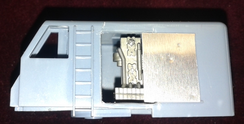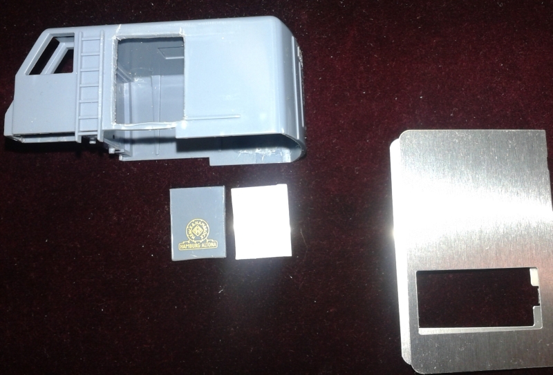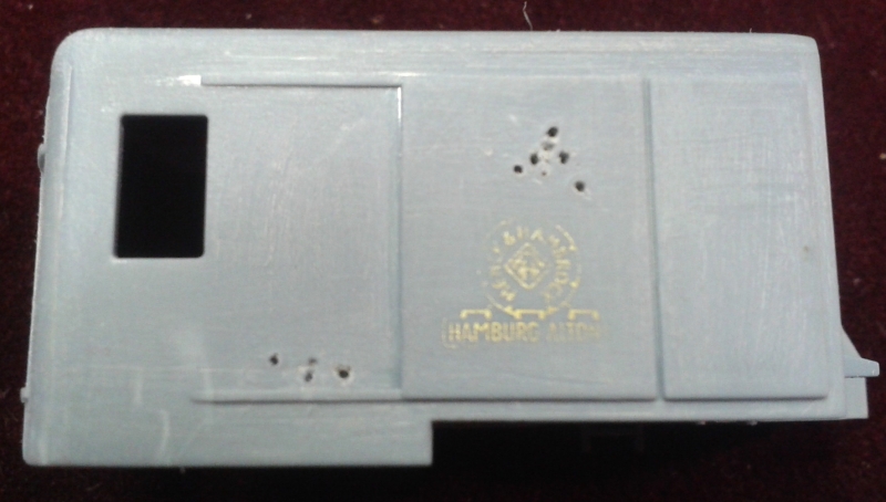 Zwotens: Durchblick schaffen. Hinter der Fahrerkabine ist eine Leiter, dann kommt die Einstiegstür (Schiebetür), die aber nur leicht erhaben angedeutet ist. Die Kanten führen das Messer sehr gut, mit etwas Geduld und sanfter Gewalt wird die Tür herausgeschnitzt. Vorsicht, der Steg unten wird sehr dünn! Die Tür muss entweder dünn geschliffen oder durch etwas dünneres ersetzt werden und die Laufschienen oben und unten werden wohl ergänzt werden müssen. Ebenso wird der Innenraum noch eine Maschine erhalten. Mal sehen, was die Bastelkiste hergibt. Damit der „alte Bagger“ die Farbe willig annimmt, werden alle Oberflächen mattiert: mit dem feinsten Schmirgelleinen die flachen Bereiche; in Ecken und Falzen kommt der Glasfaser-Radierstift zum Einsatz. Die obere Laufschiene der Schiebetür wird eingeebnet. Für die neue Tür schneiden wir ein Stückchen Alublech aus einem Disketten-Verschluss zurecht. Das kann dann auch gleich ein Paar Dellen und Beulen bekommen. Aus dem Bodenteil wird noch ein Stück vom Mittelsteg weggenommen, da soll die später sichtbare Maschine angebracht werden. Jetzt wir der „Rostfraß“ vorbereitet: an einigen Stellen wird mit dem Mini-Fräser das Material dünn gefräst, so dünn, dass schon Licht durchscheint. Dafür Wählen wir Stellen, die im Original nicht Massiv sein dürfen, also nicht gerade die Rückfront, die als Kontergewicht meist aus einem massiven Block gegossen wurde. (Die Buchstaben am Heck sind meist direkt Teil des Gussstückes.) Wir fräsen mal etwas aus der zweiten Schiebetür, dahinter an der Unterkante und noch die Unterkante des Führerhäuschens. In die entstandenen Mulden geben wir etwas Polystyrol-Kleber, der das Material anlöst und weich macht. Man kann auch (Achtung: Chemie!) Ethylacetat pur verwenden (aus der Apotheke).