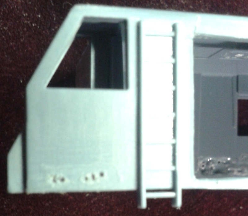 Die Gläser sollen der Zeit auch nicht unbeschadet getrotzt haben. Die Windschutzscheibe bekommt einen satten Steinschlag („Ach was, das reparieren wir nicht mehr, nächsten ersten ist hier sowieso der letzte.“). In einer Ecke kratzen wir mit dem Skalpell einige „Sprünge“ ins Glas, die sternförmig von derselben Stelle ausgehen. Im Zentrum des „Einschlags“ dann mit dem kleinsten Bohrer ein kleines bisschen anbohren. Die Scheibe am Maschinenraum bekommt auch Sprünge, dafür verliert gleich sie eine ganze Ecke.