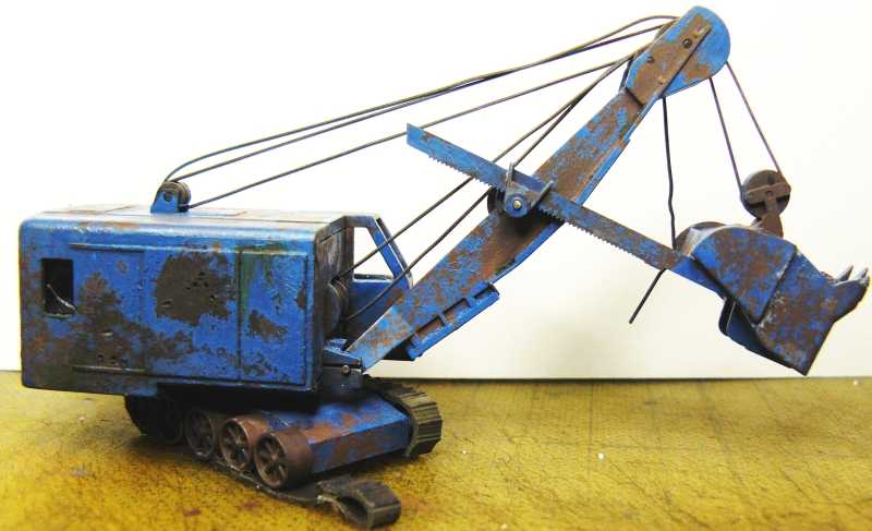 Den Gummifaden, der die Stahlseile darstellt, habe ich hier wieder eingefädelt. Da der Bagger aber bereits im Zustand der letzten Ruhe gezeigt werden soll, muss dann am endgültigen Aufstellort die nötige „Ent-Spannung“ der viel zu straffen Seile vorgenommen werden. Ich stelle mir eher vor, dass die eine oder andere Trosse verrottet, geborsten und schlaff herabhängend sein soll, so dass der ehemals so kraftvolle Löffel nunmehr verendet am Boden ruht. Vielleicht sollte man den Gummifaden durch rostfarbenen Zwirn ersetzen.