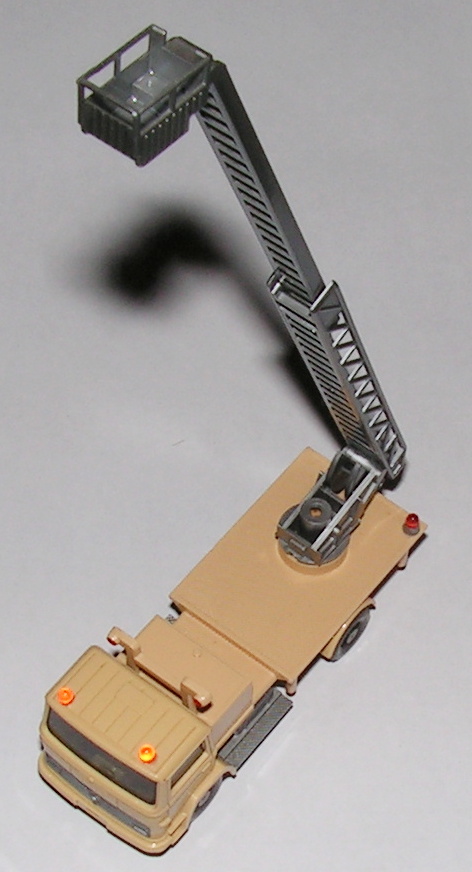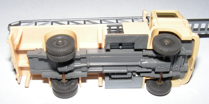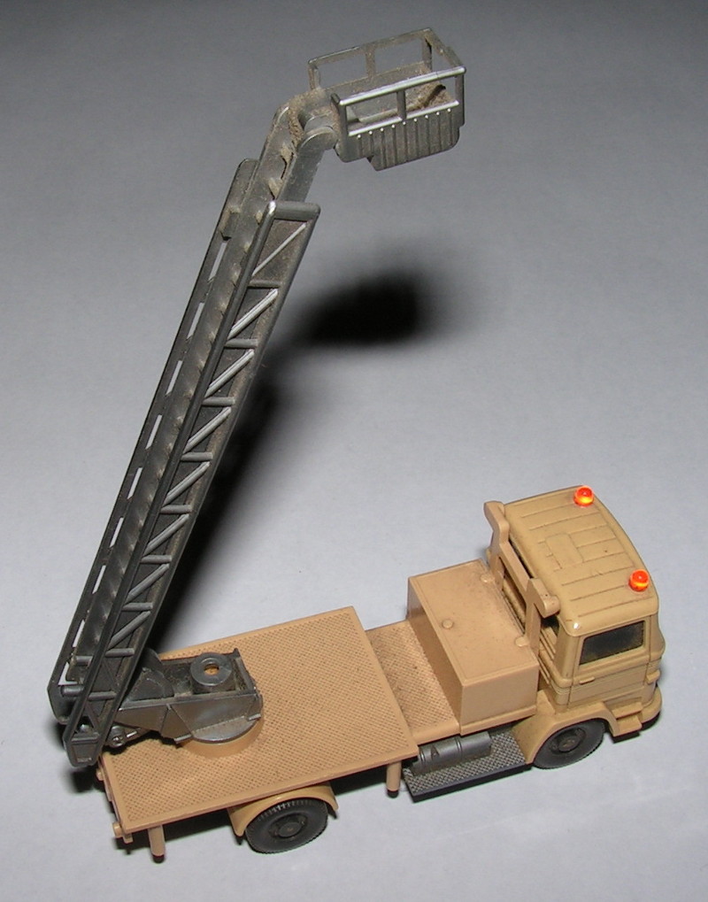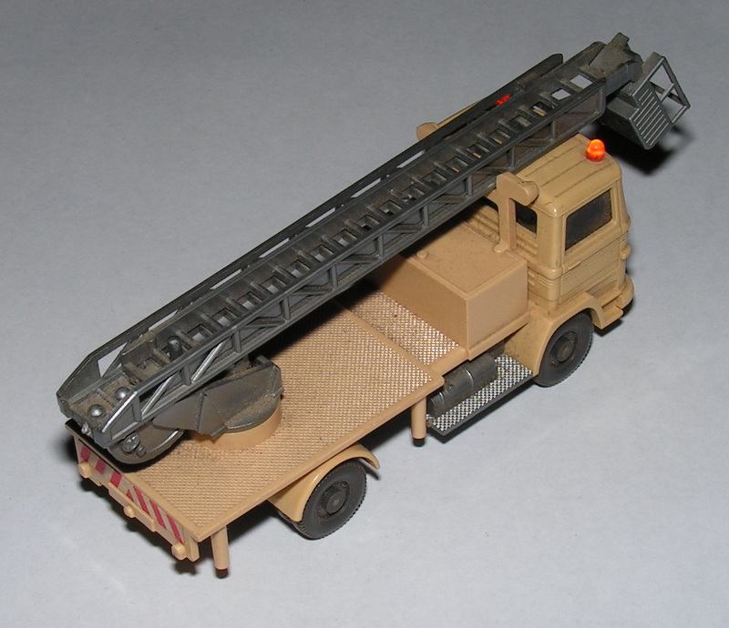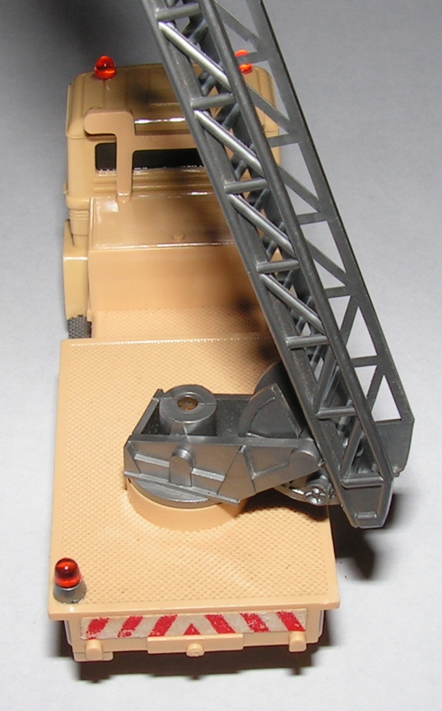 Das Ergebnis ist auf den ersten Blick ok, jedoch zeigen sich bei näherer Betrachtung kleinere Probleme: Die Riffelung und feine Rillen an Teilen der Karosserie sorgte dafür, dass einige Schmutzreste übrig blieben. Diese müssen dann wohl unter der Lupe nochmals nachgereinigt werden. Der Aufkleber wurde zwar während der Reinigung weitgehend abgedeckt, hat jedoch etwas Flüssigkeit abbekommen und sieht nicht mehr "schön" aus. Die Achsen waren vorher schon ein "hoffnungsloser Fall", dort hatte sich im Laufe der Lagerungsjahre Rost gebildet. Ein interessanter Seiteneffekt der Reinigung ist übrigens auch, dass sich die Leiter jetzt drehen lässt. Der Wassertropfen hinter der Frontscheibe ist mittlerweile getrocknet.