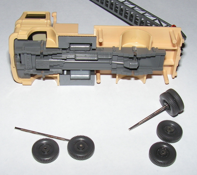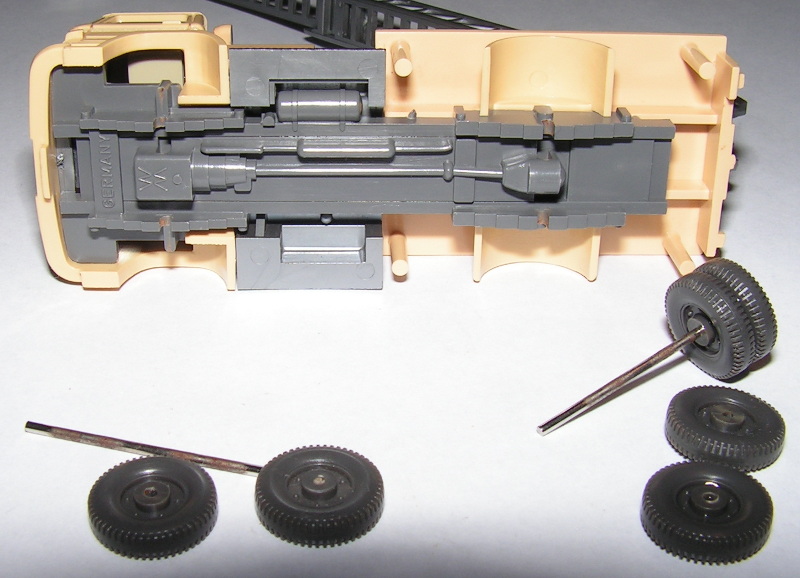 Das Herausnehmen der Achsen dürfte nicht so einfach werden, die stecken fest in den Rädern - eine Beschädigung ist sehr wahrscheinlich . Dem Modell das Bodenteil ab zu nehmen, ist wohl auch nicht möglich, da gerade die alten Modelle geklebt sind.