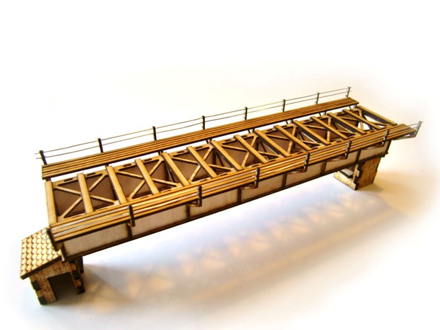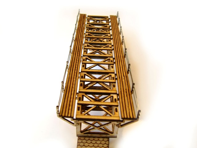 Das Ergebnis will ich euch hiermit vorstellen. Die Brücke habe ich als einfachen Bausatz realisiert. Die einzelnen Teile bestehen aus präzise per CO2 Laser geschnittenem 1mm Sperrholz. Die Konstruktion kann ähnlich wie eine Fachwerkkonstruktion durch verschiedene Steckverbindungen und etwas Holzleim ganz einfach montiert werden.