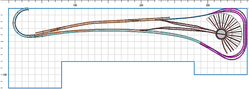 Die Steige zur oberen Ebene ist hellblau, der Abstieg dunkelblau. In der oberen Ebene ein ländlicher Bahnhof (orange), der wie ein Teilungsbahnhof wirkt. In dem Keilstück schließt das Bw an (dunkelbraun). Der Teilungsbahnhof ist natürlich keiner, sondern bildet um den Lokschuppen herum eine Kehre (violett), die auch zum Abstellen und Überholen dient. Nutzlänge dort: 990, 1040 und 1490 mm. Freilich sollte diese Abteilung von etwas Landschaft überdeckt werden. Verfolgen wir nun einmal den Streckenverlauf, aus dem Bahnhof in der oberen Ebene, Ausfahrt nach Westen. Der Zug fädelt auf die Hauptstrecke ein und verschwindet in einem Tunnel. In diesem steigt er weiter ab, macht im Osten eine Kehre und gelangt so an die Zufahrtsweiche zur Hauptstrecke in der unteren Ebene. (jetzt gelbes Gleis). Hier paradiert er an der vorderen Anlagenkante entlang, um wiederum im Osten unter ein Überwerfungsbauwerk (das oben das Bw trägt) einzufahren. Hier liegt der „kurze Sbf“, der z. B. Wendezuggarnituren beherbergen kann. Aber auch die Durchfahrt ist möglich. So käme er wieder auf der Hauptstrecke (nunmehr grün) zurück, Parade, Tunnel. Drei Möglichkeiten: „Langen Sbf“ durchfahren und nochmals auf der die gelbe Parade; im Sbf stehen bleiben und Motor abkühlen lassen oder wieder den Anstieg (hellblau) auf die obere Ebene, durch den Bahnhof und in der Speicher-Kehre (violett) parken oder die Runde von neuem beginnen.