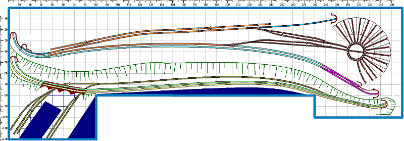 Bleibt die braune Strecke in der unteren Ebene. Diese fällt neben der Hauptstrecke sanft ab auf 0-Niveau, bis sie unter einem Viadukt die Abstellgruppe erreicht. Die Harfen am Ende denken wir uns als Ladegleise am Kai, zwischen den beiden Gleisbündeln und rechts davon wäre jeweils Platz für ein Hafenbecken. Auch den Bereich südlich der Paradestrecke können wir uns als Anschnitt eines Flussufers denken.
