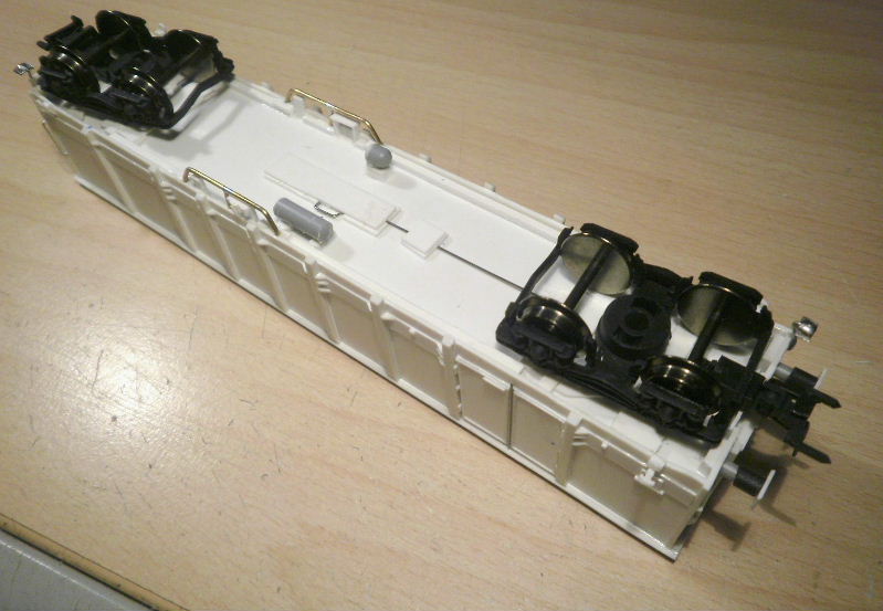 Die Drehgestelle sind von Piko (6 € für zwei Stück scheinen mir fair zu sein). Sie sind schön und die Radsätze sind leichtläufig. Allerdings scheinen sie mir etwas zu zierlich und schlank zu sein. Aber alle mal besser als meine Eigenbau-DG.
