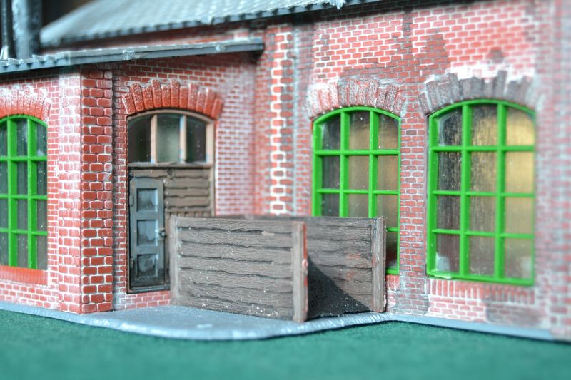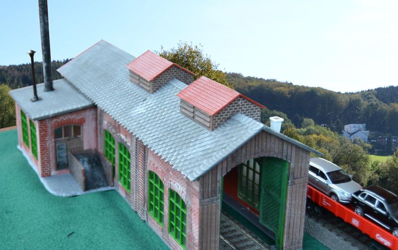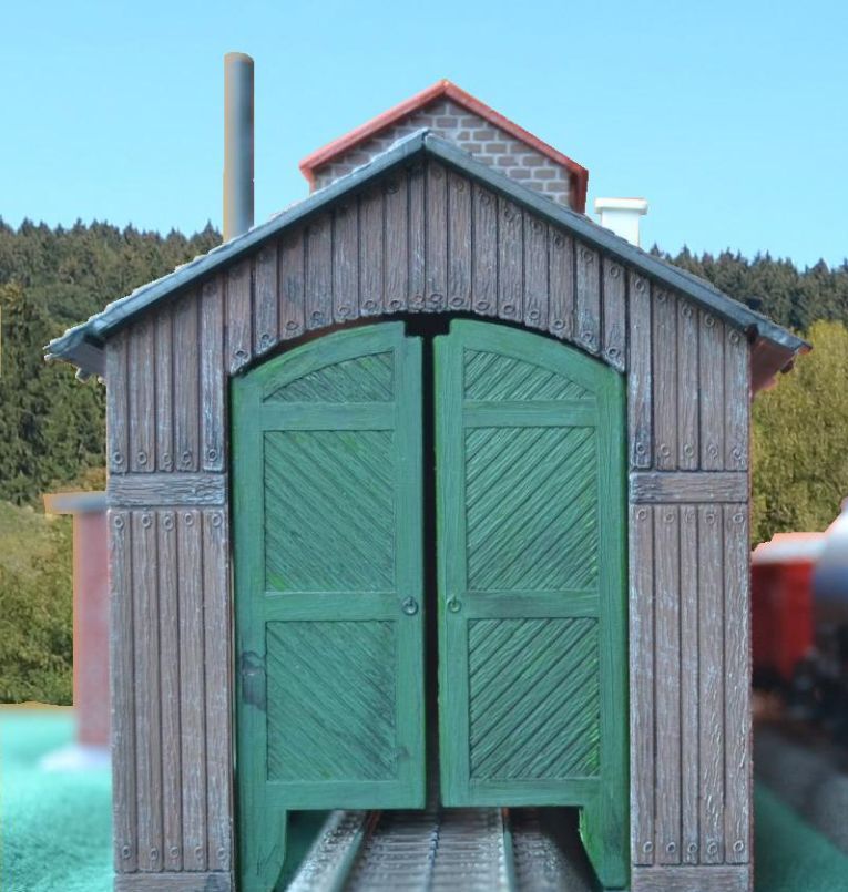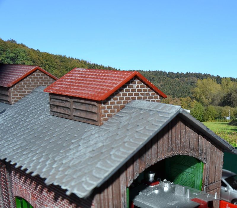 „So, da hätten wir doch alles beisammen, für Deine Rangierlok ist der allemal groß genug, da passt sogar eine ausgewachsenen Schlepptenderlok rein.“ Junior strahlt und ist schon ganz gespannt. Es folgt eine kurze Einführung in die Details; insbesondere sind wir uns einig, dass der Plastikglanz nicht so doll aussieht, und die Schuppenfront soll wohl Holz darstellen, ist aber am selben Spritzlingsbaum wie die Ziegelmauer. Das geht ja gar nicht!