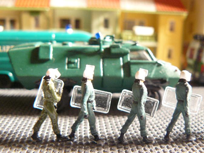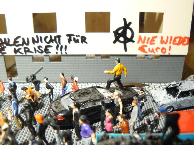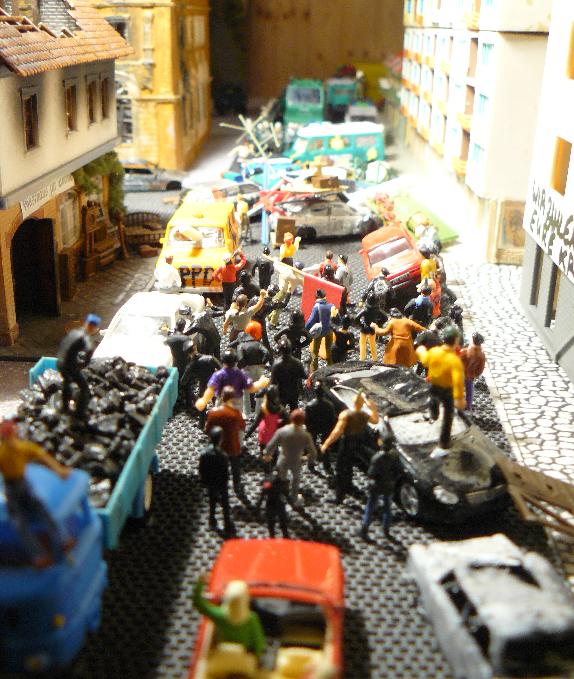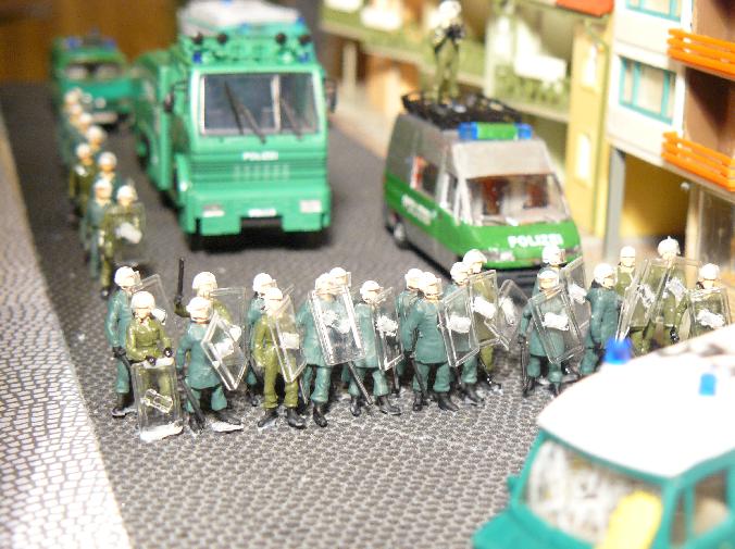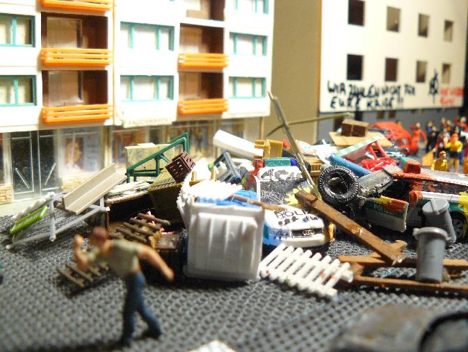 Da es die Anlage von damals nicht mehr gibt und ich auf meiner neuen Anlage keine anarchistisch anmutende Demo mehr anbringen wollte, habe ich mir vor zwei Jahren den Spaß gemacht, die vorbereiteten Straßenblockaden und Menschenmassen wenigstens kurzzeitig auf einer Art "temporärem Diorama" aufzubauen (Platte nehmen - alles drauf - Fotos machen - alles wieder runter).