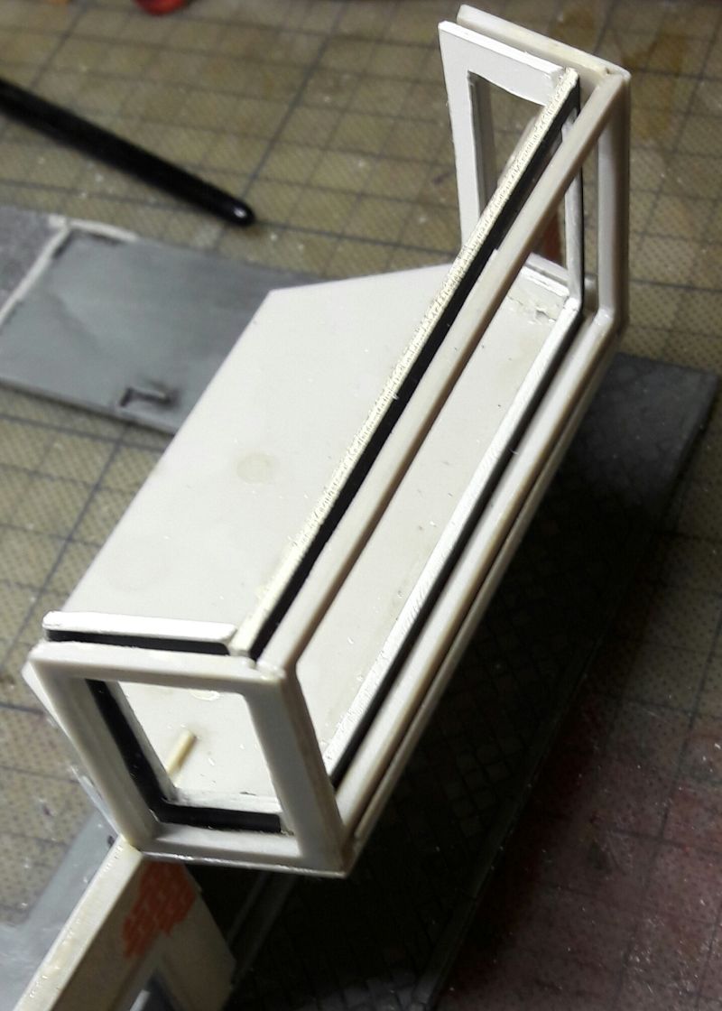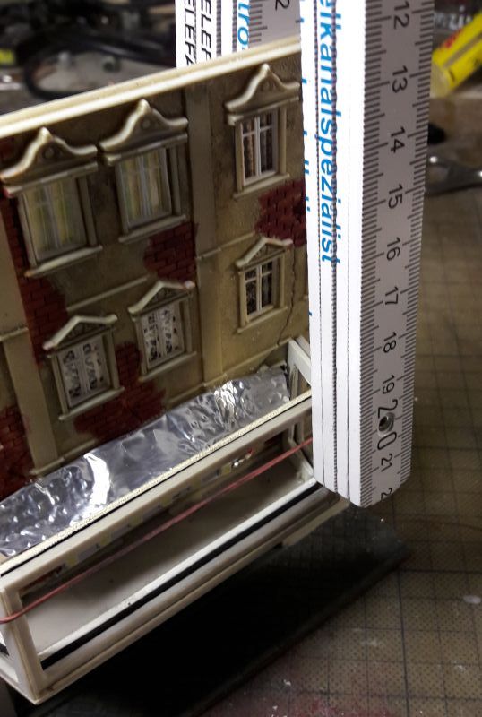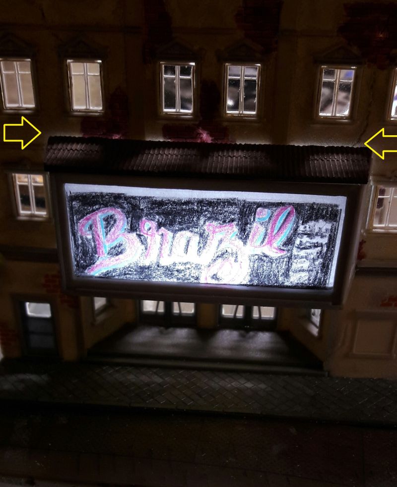 Um der neuen Film-Reklame Halt zu geben, setzen wir einen Rahmen direkt hinter die Original-Wandteile. Ein schmaler Spalt soll das Plakat halten. Erster Test mit einem hand-gescribbelten Plakatersatz. ("Brazil", GB 1985, R: Terry Gilliam) Natürlich soll die Beleuchtung später nicht nach oben abstrahlen. In der Restekiste findet sich ein altes Fabrikdach, das, passend zugerichtet, den "Deckel" des Reklamekastens bildet. Zur Ausleuchtung wurde ein Strip mit 6 weißen LEDs an die Fassade geklebt. Der erste Test zeigt, dass das Licht, auch durch die Reflektion im Kasten, deutlich an der Kante Fassade/Kastendeckel durchscheint. Um das abzustellen, kleben wir noch eine Streifen dicker Alufolie über den LEDs in den Kasten an die Fassade. Mit etwas Gefühl und Geduld lässt sich die Folie auch um die Mauerpfeiler schmiegen. Hier übrigens ein einfaches Hilfsmittel im Bild. Da das dünne Gummibändchen nicht genügend Druck auf die frische Klebestelle Kasten-Fassade brachte, wurde kurzerhand der Gliedermaßstab (vulgo Zollstock) zur King-Size-Wäscheklammer befördert und hielt alles bis zum Ablüften des Klebers am Platze. Durch die Konstruktion bleiben die Filmplakate austauschbar, solange der Kastendeckel nicht festgeklebt wird. Hier im Bild hat das Plakat ("Star Wars", USA, seit 1977, R: George Lucas u. a.) an der oberen Kante eine Pack-an aus Klebefilm, mit dem es sich leichter aus der Halterung nehmen lässt. +++ Fortsetzung folgt +++