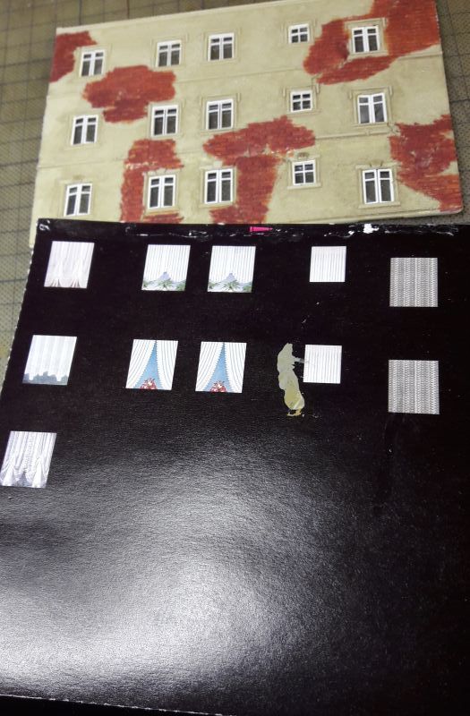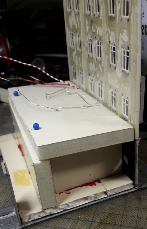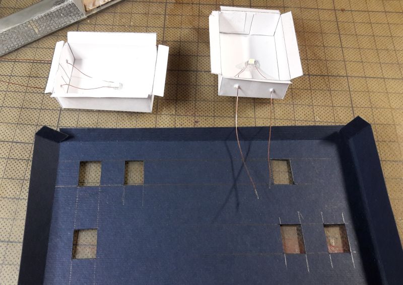 Die Wände mit einigen Türen beklebt (Restekiste oder Eigenbau, siehe dazu "Schnellste Tür im Modellbau). Aus der Decke des Foyers ragen schon die Anschlussdrähte der Beleuchtung. Zwei weitere LEDs wurden unter der Decke des Eingangsbereiches vor den Kassenschaltern angebracht und eine fünfte als Deckenlicht in "Kasse 2". FALLER resp. POLA hatten eine Lichtmaske beigefügt, die jedoch sämtliche Fenster durchscheinend lässt. Das wirkt unnatürlich. In welchem Haus, zumal wenn es ein Mehrparteienhaus ist, brennt denn in allen Zimmern gleichzeitig das Licht?