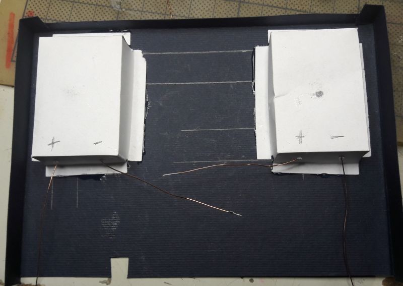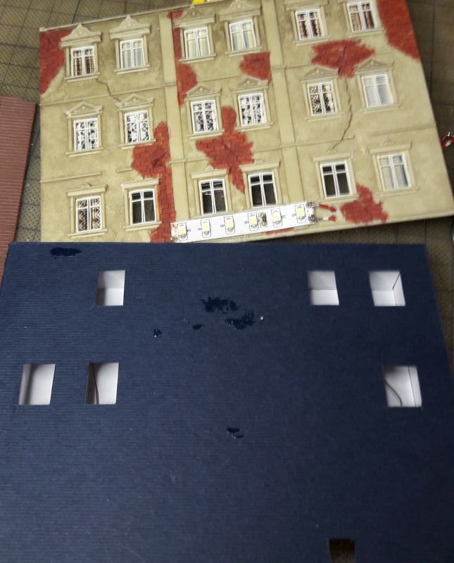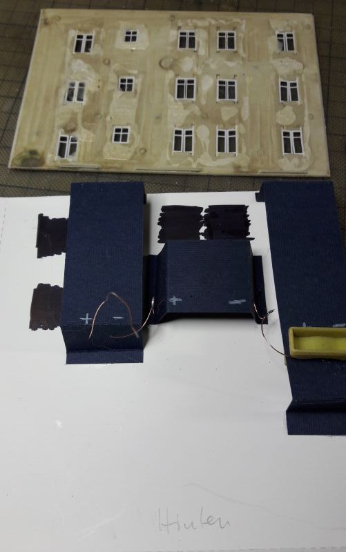 Es bieten sich nun zwei Methoden an. Aus lichtdichtem Karton wird eine neue Maske gefertigt, die nur einige ausgewählte Fenster offen lässt. Aus Papier oder dünnem Karton werden kleine Kästchen geklebt, die mit je einer weißen LED versehen werden ... ...und dann an entsprechender Stelle in die neue Maske geklebt werden. Zur Sicherheit wurden Plus und Minus der LED-Zuleitung direkt angeschrieben, um späteren Verwechslungen vorzubeugen. Hier noch zu sehen: der LED-Strip für die Leuchtreklame. An der Rückfront haben wir einen Teil der Originalmaske verarbeitet. Hier wurden einige Fenster mit schwarzem Filzschreiber verdunkelt, die anderen erhielten einen Pappestreifen hinterklebt, der die LED etwas auf Abstand hält. Die LEDs wurden so positioniert, dass sie nie direkt hinter einem Fenster sitzen, sondern immer etwas daneben oder darunter. Zur Plus-Minus-Markierung wurde dann ein weißer Buntstift verwendet.