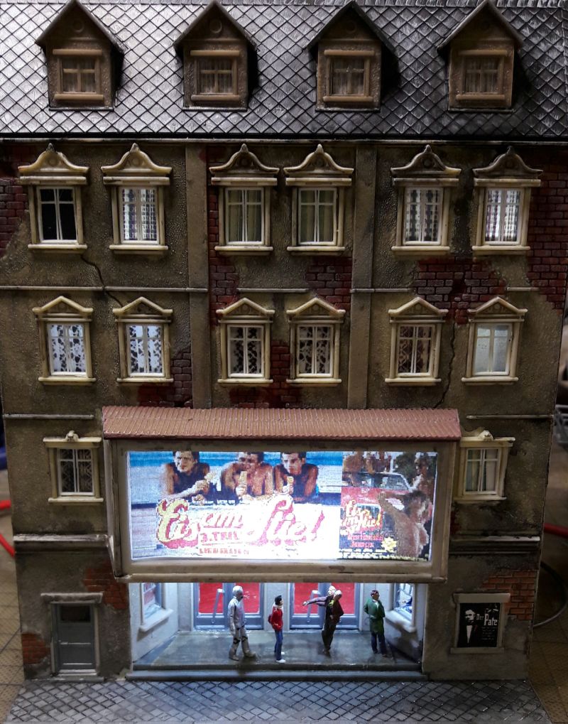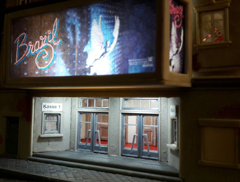 Vor dem letztendlichen Verkleben der Wände daran denken, die Kassiererin an Ihren Platz zu setzen. Da man an die "Türen" zum Vorführsaal nicht näher herankommt, genügen hier die Attrappen, die die dritte Dimension durch Farbgebung vortäuschen.