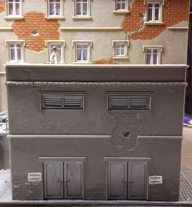 Im Original-Bausatz sind die Teile eher grau in grau gehalten. Eine gezielte Behandlung mit Acrylfarben (Ziegelwerk, Mauer), Metallic-Schreiber (Lüftungsgitter), Lackfarbe (Türen) und - nicht zuletzt - Staubfarben (Dach, Wand) macht auch diese schamhaft versteckte Immobilie zum Schmuckstück. Gruß