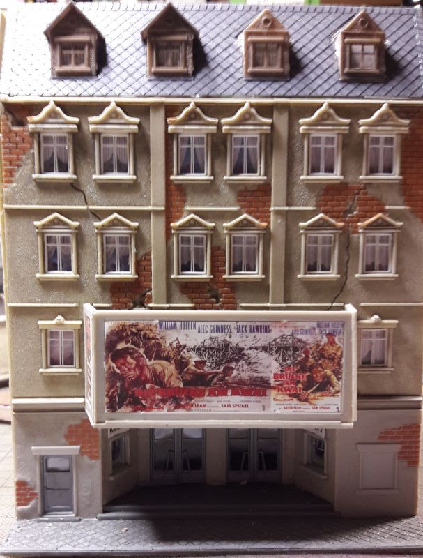 Notdürftig zusammengestellt sah die Fassade so aus. Der angekündigte Filmklassiker "Die Brücke am Kwai" (GB/USA 1957; R: David Lean) ist zwar allein wegen der berühmten Melodie unsterblich und hat damals 7 Oscars abgeräumt, wird aber im Zuge der Renovierung aus dem Programm genommen. Warum war das Gebäude so wenig stabil? Die Klebung, die eigentlich das Dach des Hinterhauses an der Mauer halten sollte, ließ sich leicht aufbrechen. Die Seitenmauern kamen mir von selbst entgegen. Die obere Teil der Fassade über dem Eingang ist aufgesetzt. Wie man sieht, wurden die Teile vor dem Zusammenbau nicht von den Anguss-Nasen befreit. Somit war die Verklebung nur punktuell, also eben genau an diesen Nasen.