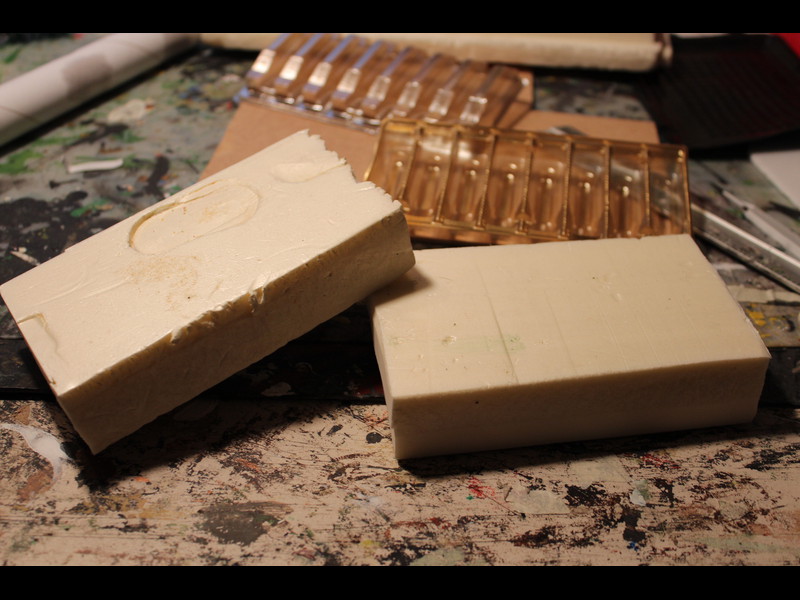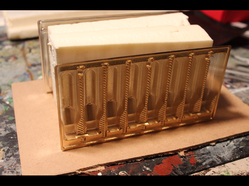 Dann werden 2 Styroporblöcke zusammengeleimt und mit den Schokoladenflaschenhaltern auf einer Grundplatte aufgeklebt: