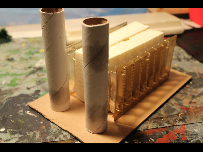 Hier sind nicht nur die hinteren Stützen mit Bastelwellpappstreifen versehen, sondern haben wie alle anderen auch zur Verfestigung einen Anstrich mit Ponal-express bekommen: