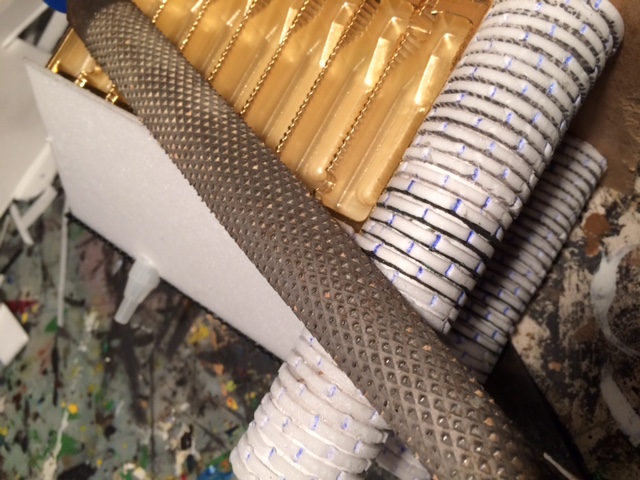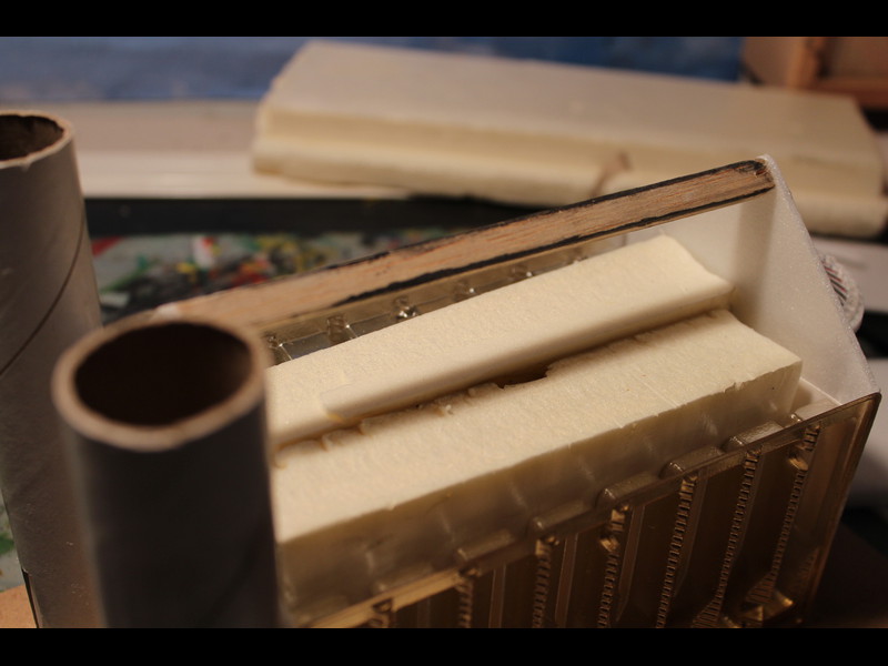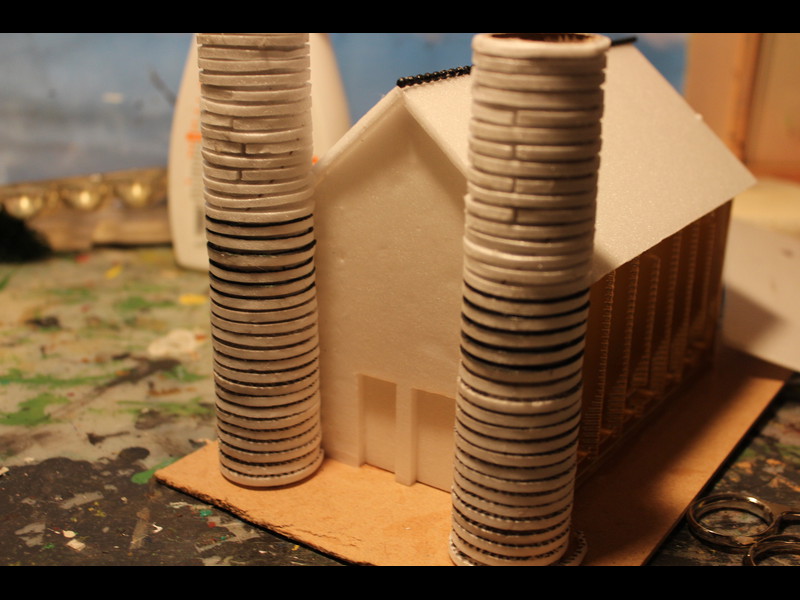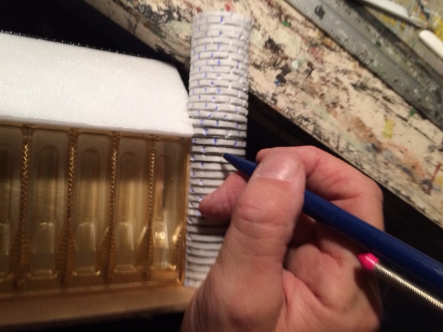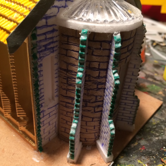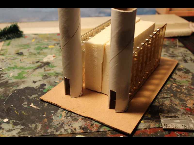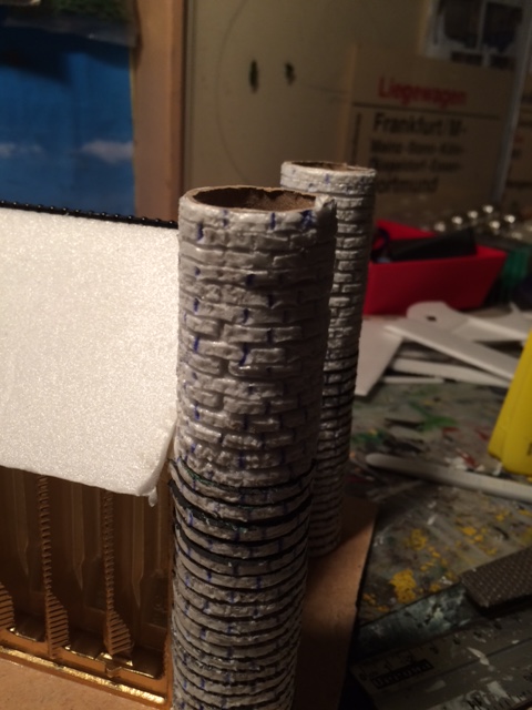Mit ca 2mm dicken Depronstreifen werden die Türme umklebt, Daraus wird später eine Steinstruktur entstehen: