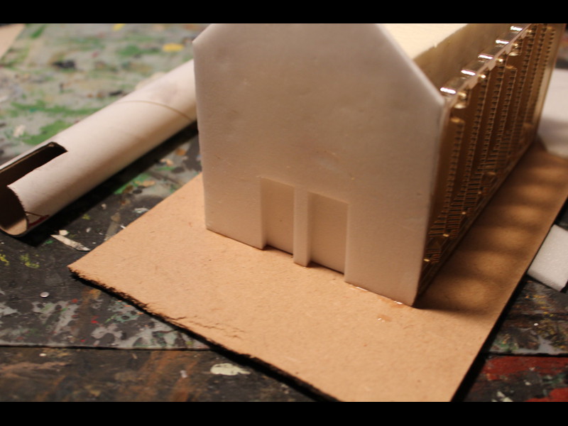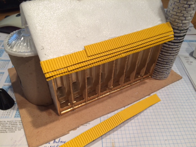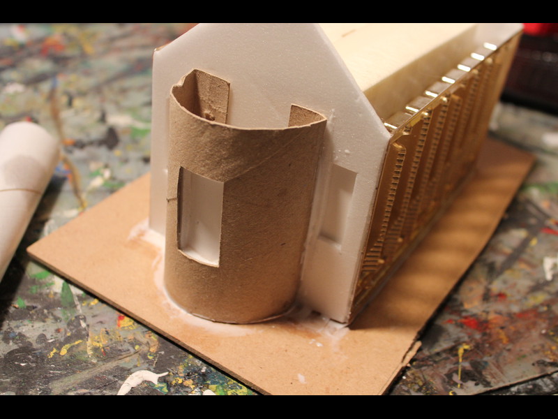 Dann werden sie wieder aufgeklebt und bekommen noch eine Umsäumung von Bastelwellpappe, ca 1/2cm breit. Auch der Dachreiter wird bebastelwellpappt: