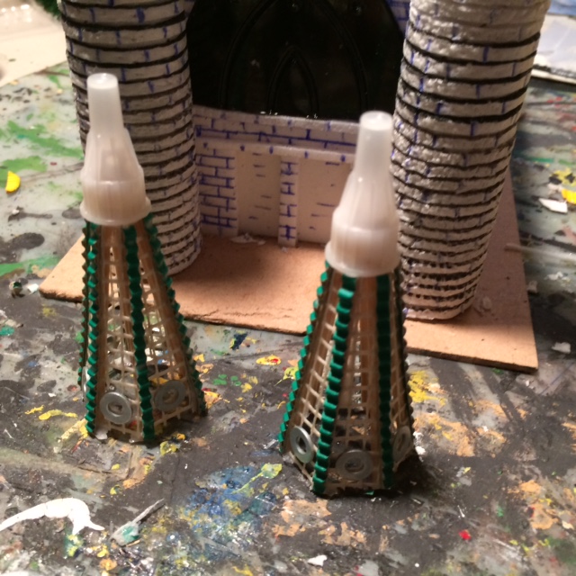 Dann wird schmal ausgeschnittene grobere Bastelwellpappe angeklebt. Insulinspritzenabdeckungen müssen als Turmspitzen herhalten.