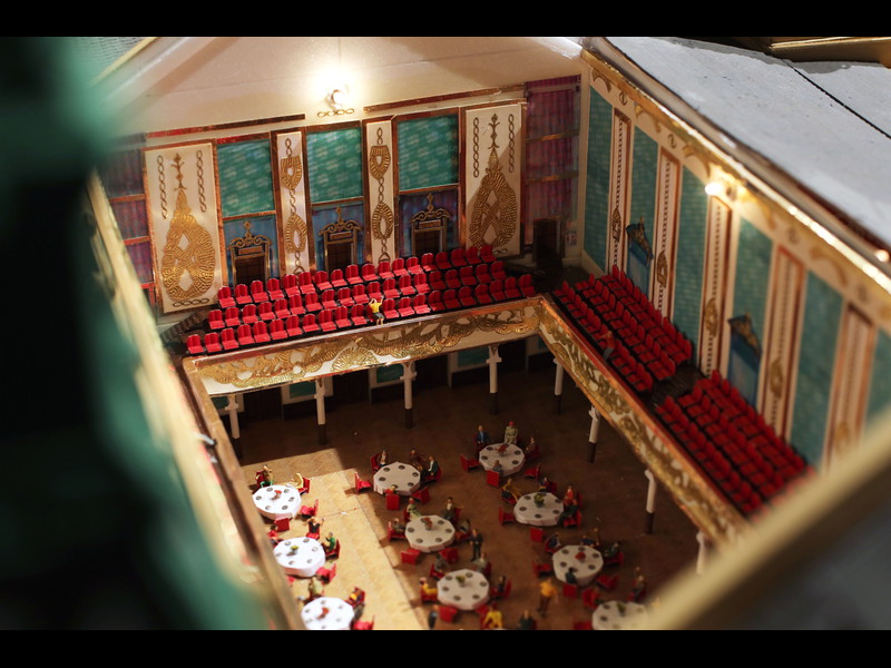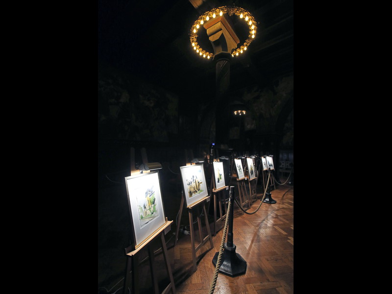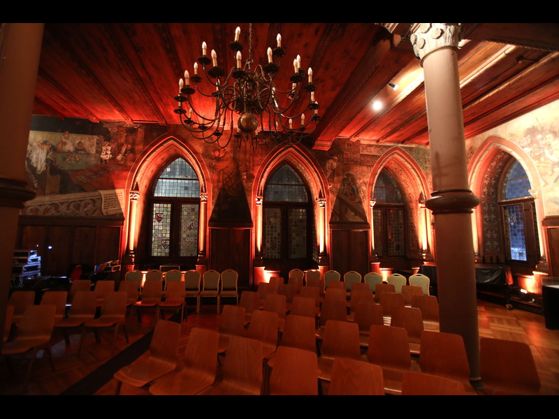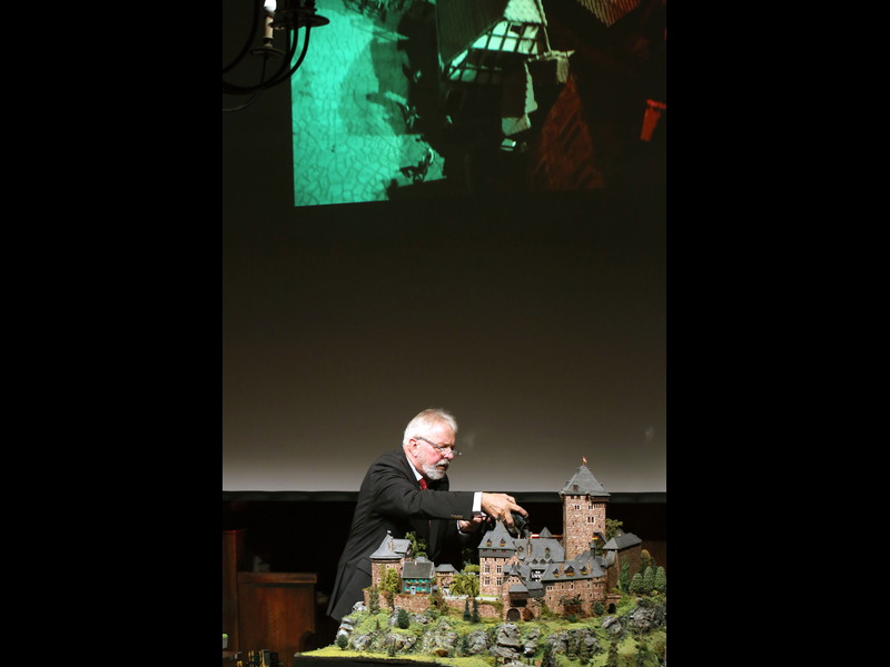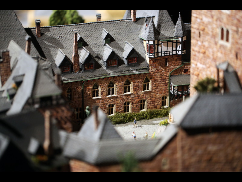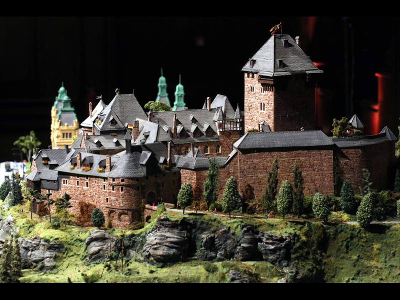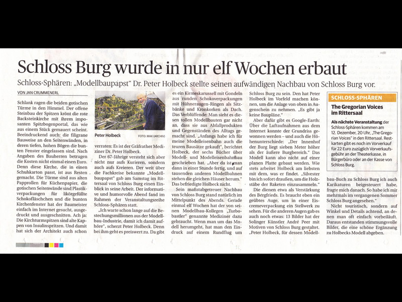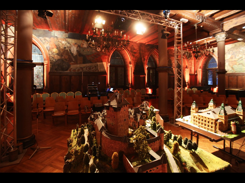 Einen winzigen Punkt hätte ich aber anzumerken: An den Türmen fallen doch einige Stellen auf, wo wohl noch Holzleim oder die Papprollen durchscheinen, da müsstest Du vielleicht doch noch mal mit Farbe drüber. Je nach Blickwinkel sieht man das zwar praktisch nicht, aber wenn dann die Strahler von außen drauf halten, könnte das doch wieder zu sehen sein.