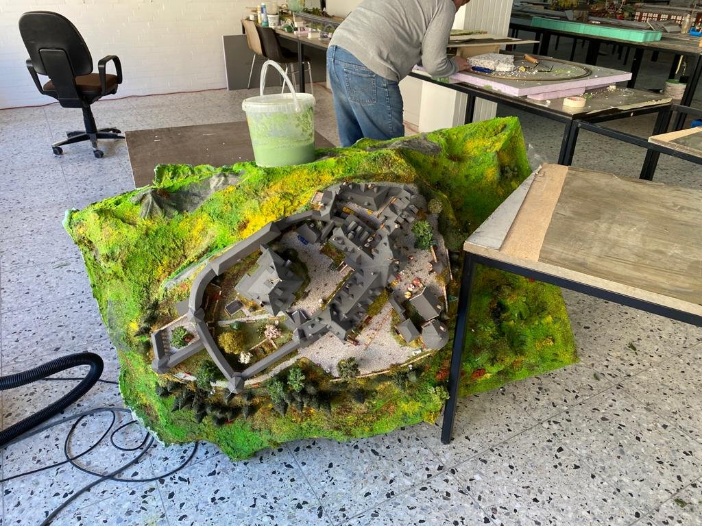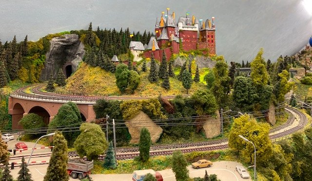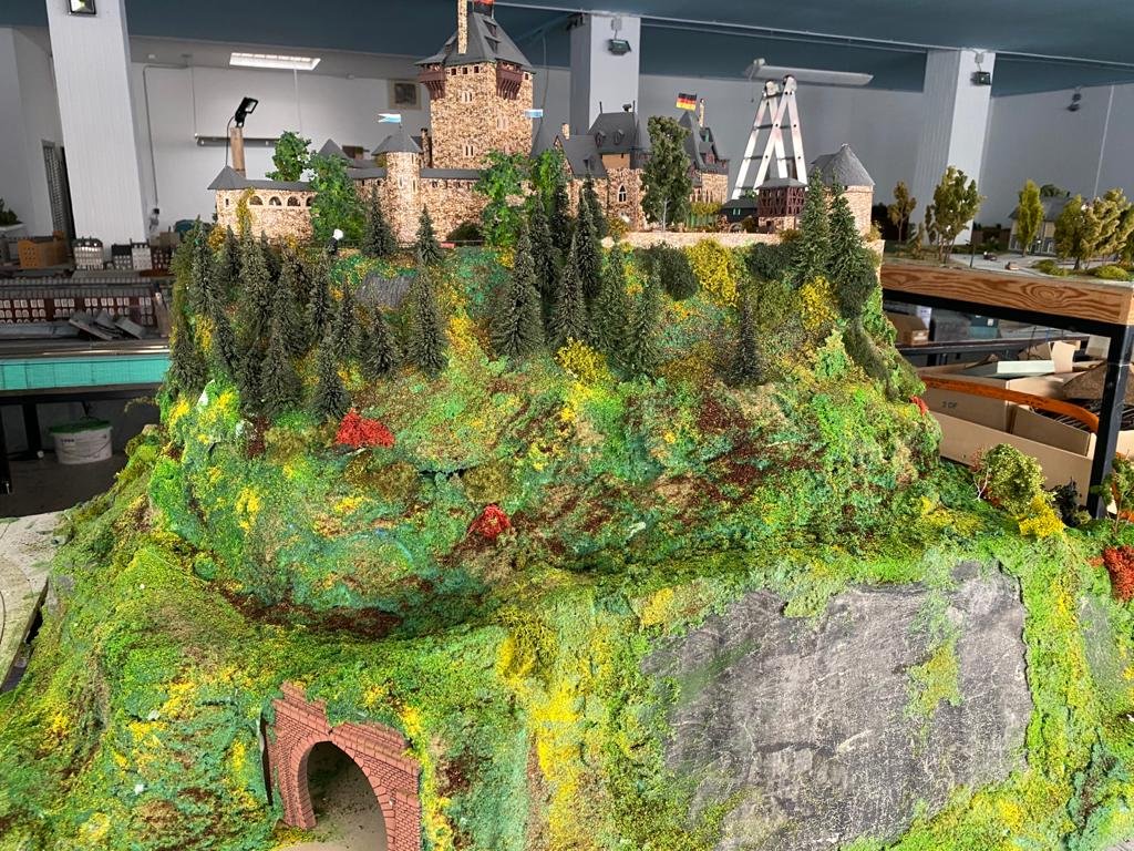 Hier das auf meiner Anlage: Das große Modell passte räumlich nicht mehr auf die Wuppertalachse und der Heimatverein Solingen-Gräfrath platzierte es im deutschen Klingenmuseum: Und jetzt musste auf der Achse eine Kehrschleife mit einem Berg überbaut werden und da kam ich auf die Idee, mit Schloß-Burg von meiner Anlage umzuziehen und dort auf einem neu gebauten Berg zu platzieren.