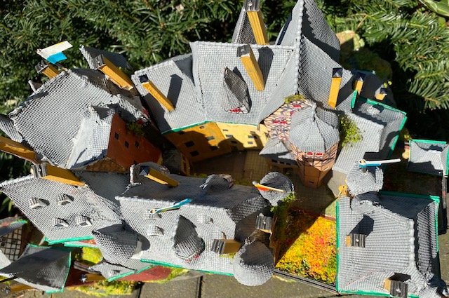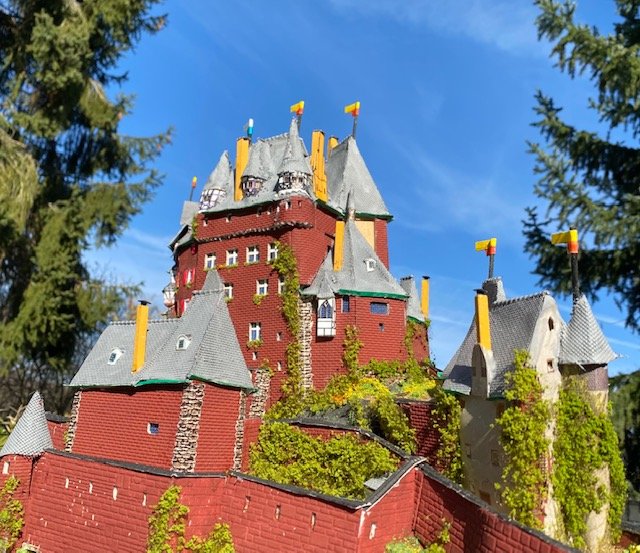 ich hatte mir überlegt als Ersatz für Schloß-Burg auf meiner Anlage Burg Eltz einzubauen und habe das Modell jetzt fertig und draußen fotografiert: