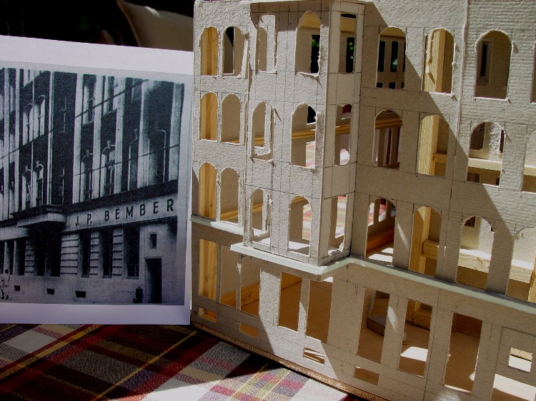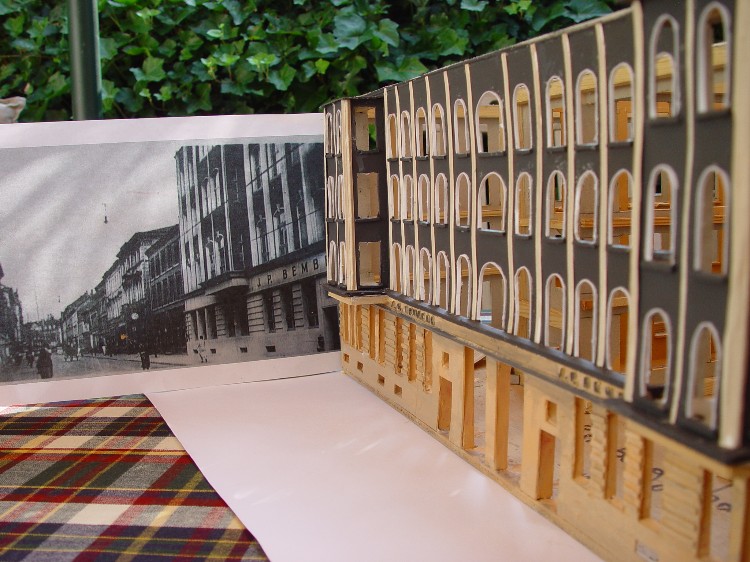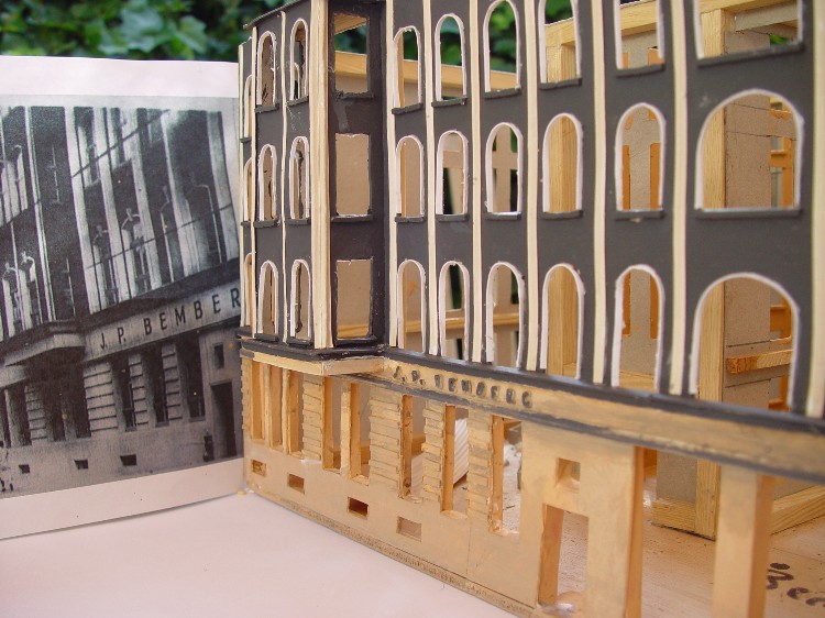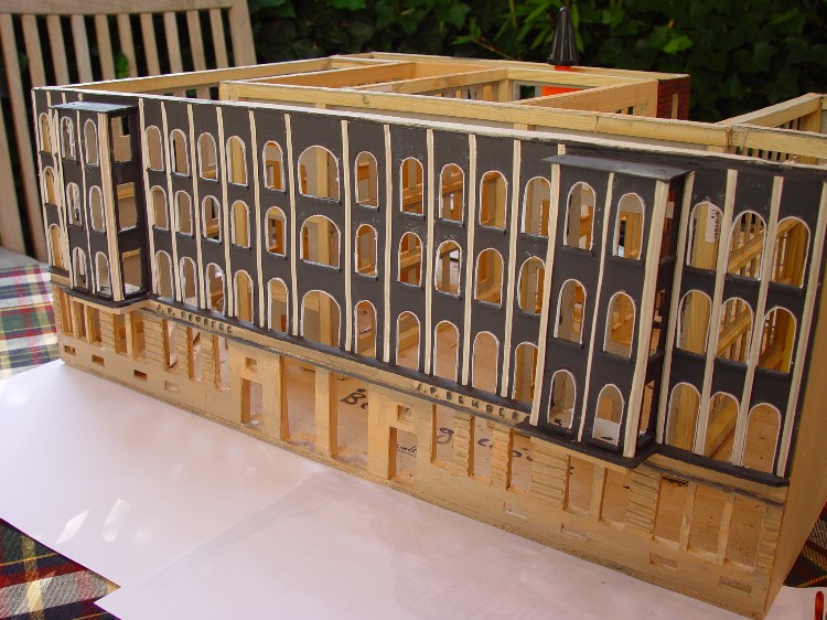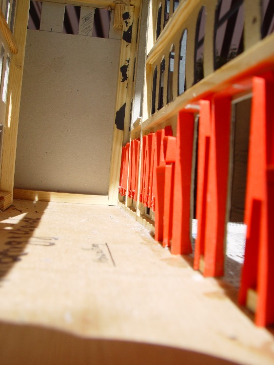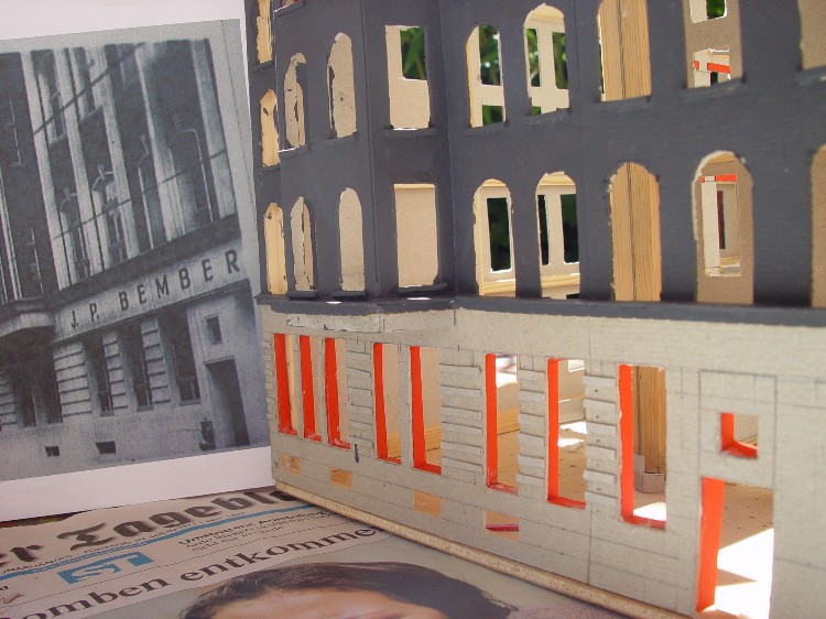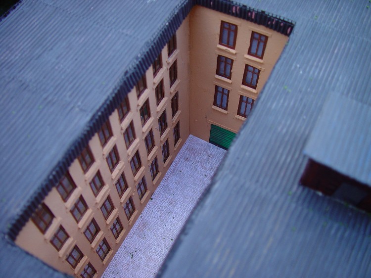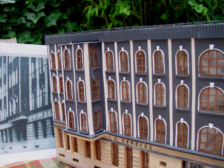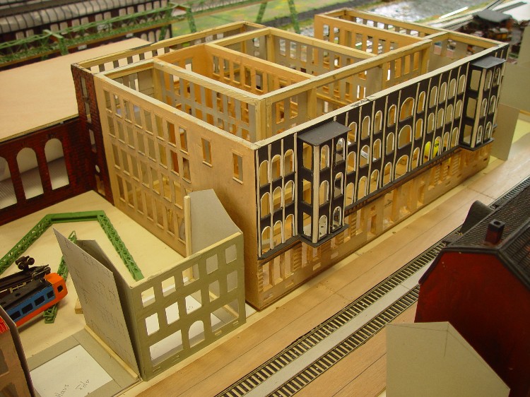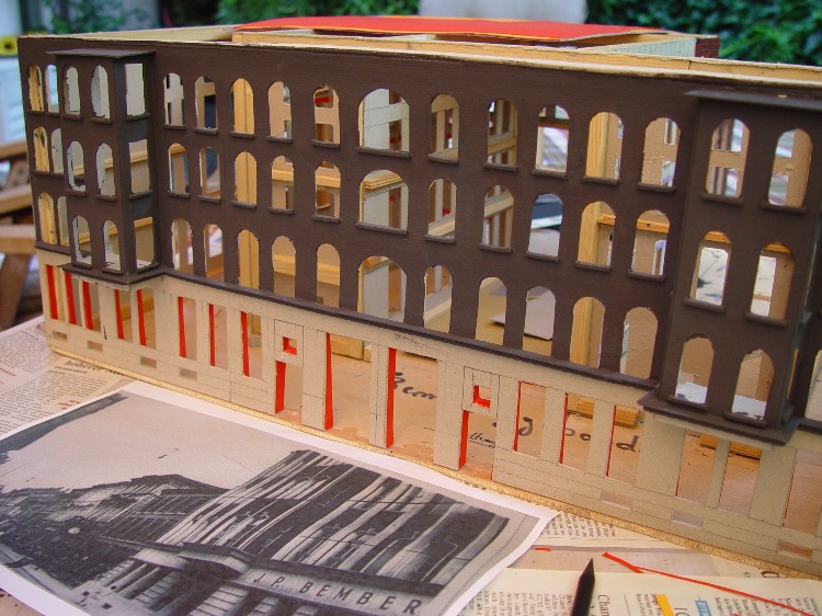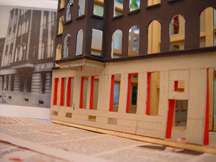 Eine andere Farbe verdeutlicht aber im Nebeneffekt das neu Angeklebte. Hier liegen ja beim Vorbild die Fenster im Erdgeschoß tief innen, d.h. das Mauerwerk ist so dick, wie ich es hier mit den roten Pappstreifen simuliert habe.