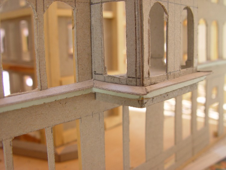 Vorbildfoto: Nun wurde zuerst der Sims über dem Erdgeschoß gebaut: Die Ungenauigkeiten werden noch abgeschliffen.