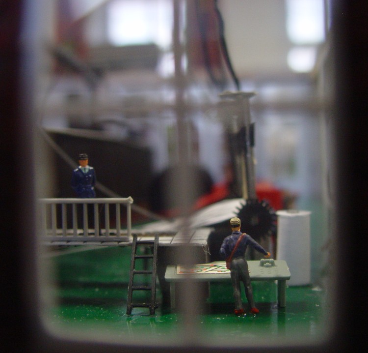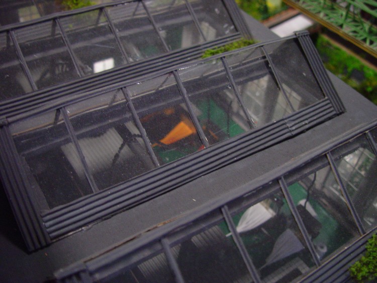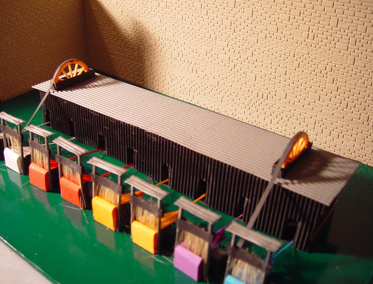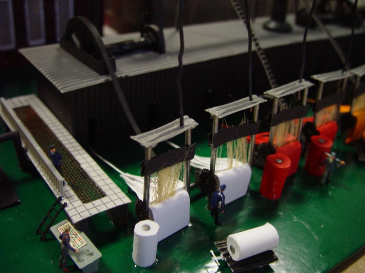 nun sind noch weitere Transmissionen, Zahnräder, Preiserlein, Leitern, Kessel, Stoffballen, Transportwägelchen usw. hinzugekommen und dann wurde die Inneneinrichtung in die Halle verfrachtet: