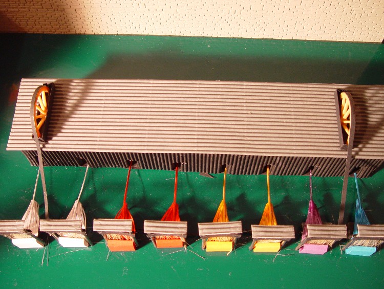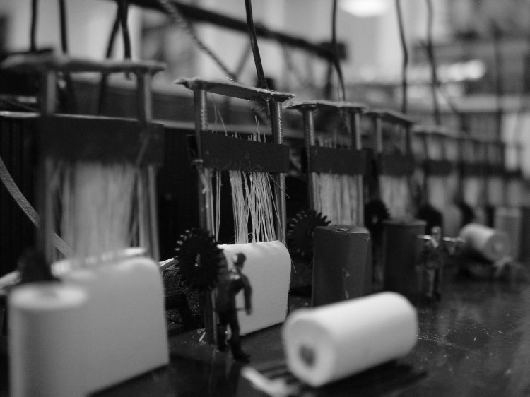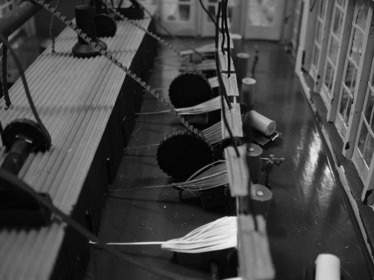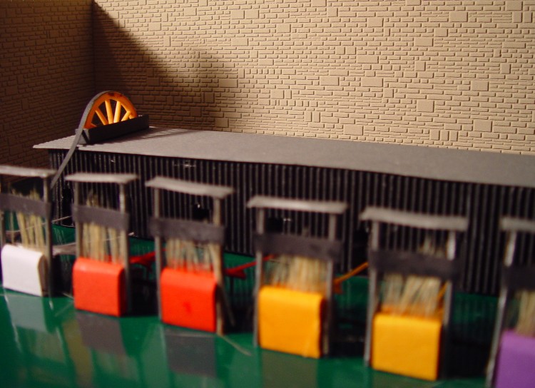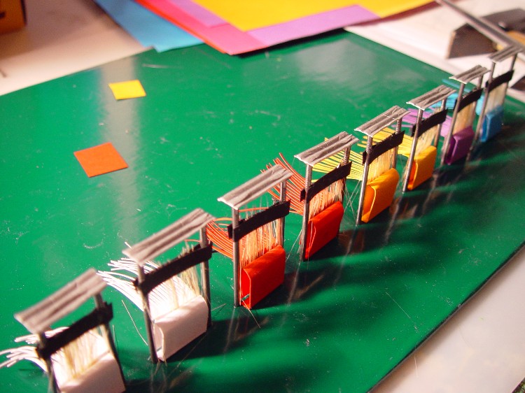 Dann wurden Reste von Schilfgras aus dem Wupperbau zweckenfremdet Die Stoffbahnen wurden nun mit verschiedenfarbigen Pappen imitiert Jetzt wurden die Fasern "gebündelt" und als Einzelstrang aus einem Indoorgebäude herausgeführt, in dem der Strang hergestellt wird. Von oben beginnt jetzt der Antrieb durch die Transmission.