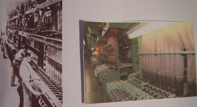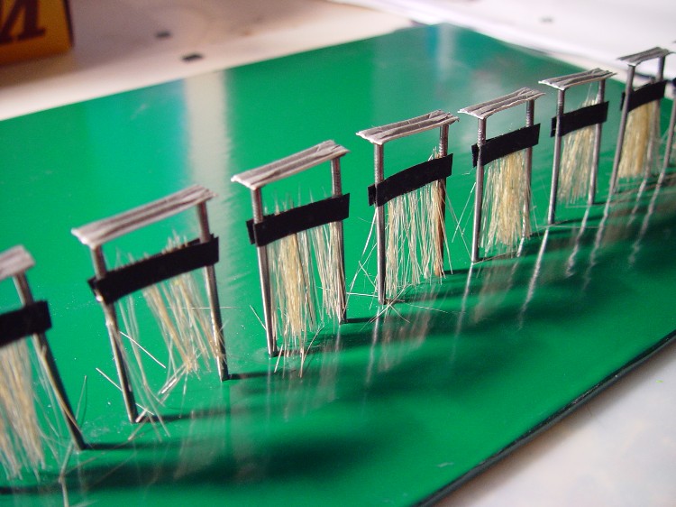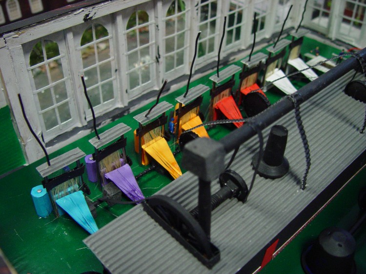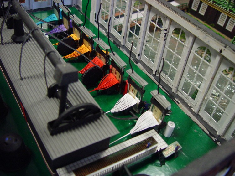 Im Internet fand ich Webstühle in Serie, wie sie wohl in der alten Fabrik gestanden haben. Dann habe ich die Grundfläche mit grüner Klebefolie überzogen und als Begrenzung der Webstühle Nägel eingeschlagen. Der Abstand mußte nur so breit sein, daß eine gewebte Stoffrolle noch auf einen Wikinglaster passt.