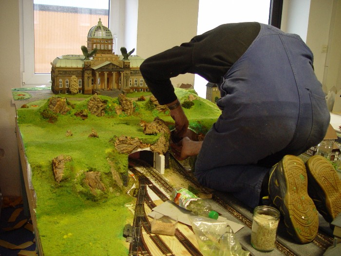 Dann wurde mit der Leberwurstmethode ein Leim-Wasser-Farbe-Sägemehgemisch aufgebracht und mit Grasflocken begrünt.