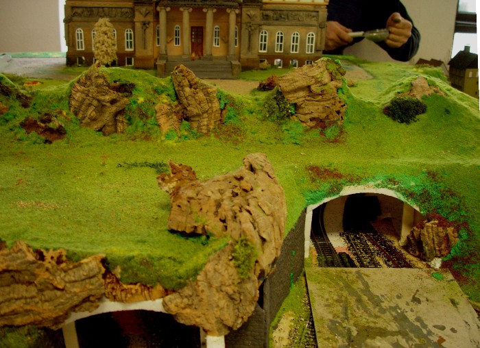 Wir haben auf das vorbereitete und verschraubte Berggerüst mit doppelseitigem Teppichklebeband die Landschaft vorgeformt und Kork als Felsen eingebettet: